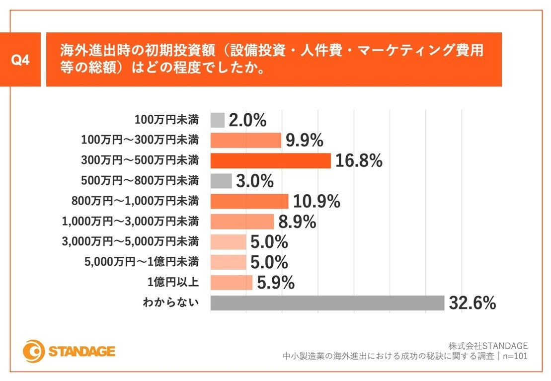 「Q4.海外進出時の初期投資額(設備投資・人件費・マーケティング費用等の総額)はどの程度でしたか。」(n=101)と質問したところ、「300万円〜500万円未満」が16.8%、「800万円〜1,000万円未満」が10.9%、「100万円~300万円未満」が10.9%という回答となりました。