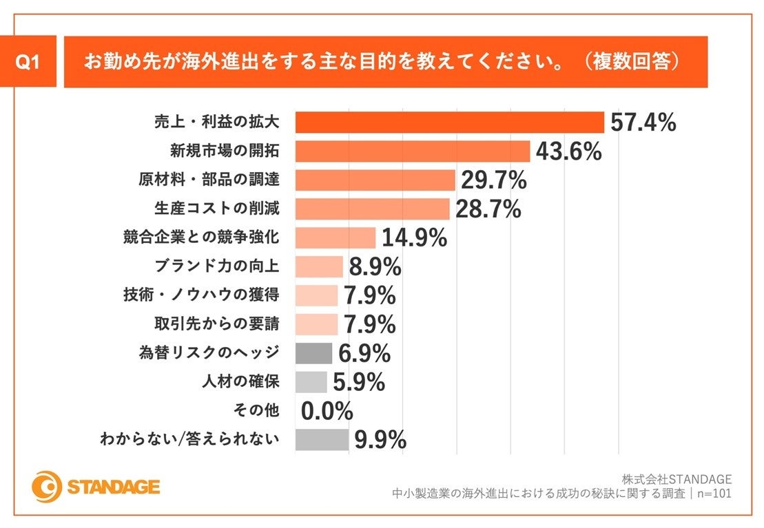 「Q1.お勤め先が海外進出をする主な目的を教えてください。(複数回答)」(n=101)と質問したところ、「売上・利益の拡大」が57.4%、「新規市場の開拓」が43.6%、「原材料・部品の調達」が29.7%という回答となりました。