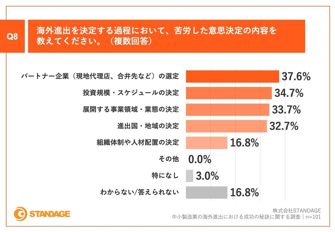 「Q8.海外進出を決定する過程において、苦労した意思決定の内容を教えてください。(複数回答)」(n=101)と質問したところ、「パートナー企業(現地代理店、合弁先など)の選定」が37.6%、「投資規模・スケジュールの決定」が34.7%、「展開する事業領域・業態の決定」が33.7%という回答となりました。