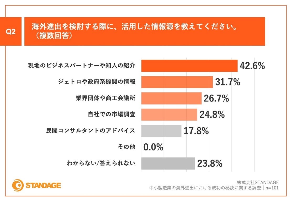 「Q2.海外進出を検討する際に、活用した情報源を教えてください。(複数回答)」(n=101)と質問したところ、「現地のビジネスパートナーや知人の紹介」が42.6%、「ジェトロや政府系機関の情報」が31.7%、「業界団体や商工会議所」が26.7%という回答となりました。