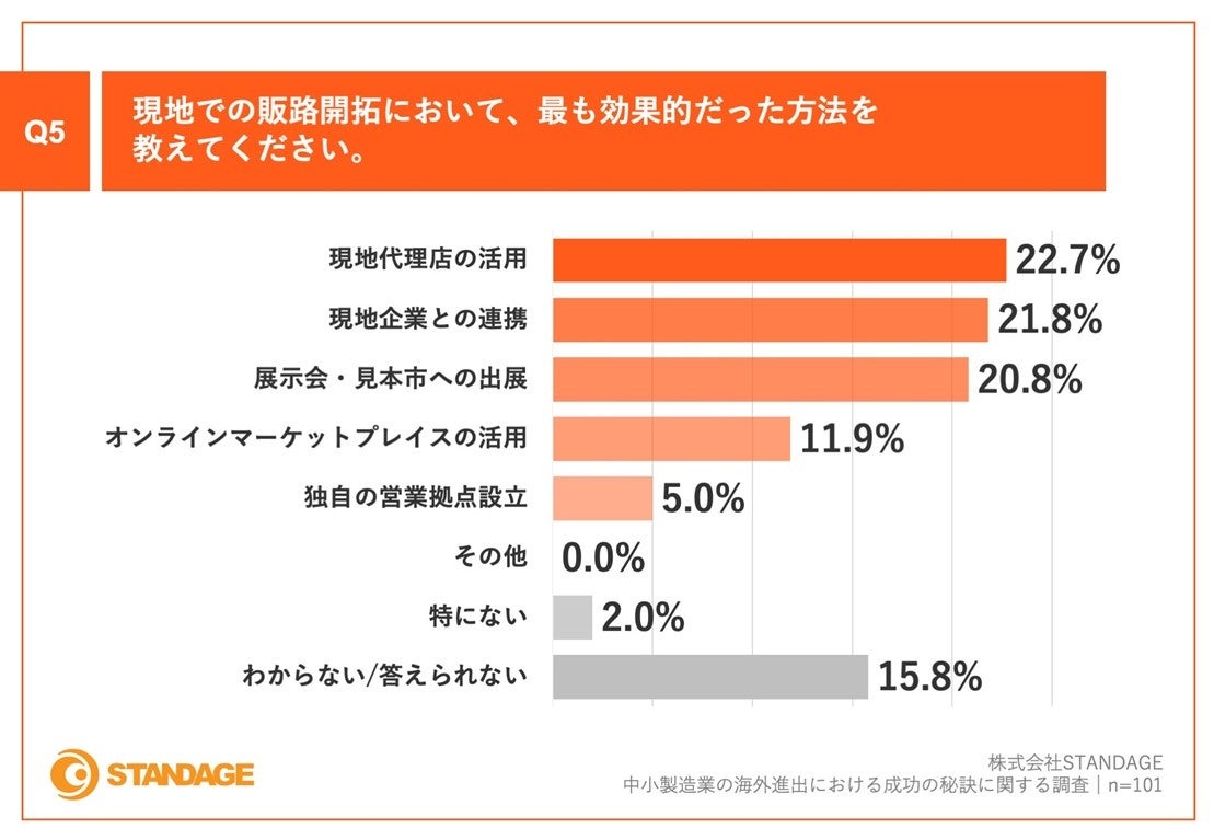 「Q5.現地での販路開拓において、最も効果的だった方法を教えてください。」(n=101)と質問したところ、「現地代理店の活用」が22.7%、「現地企業との連携」が21.8%、「展示会・見本市への出展」が20.8%という回答となりました。
