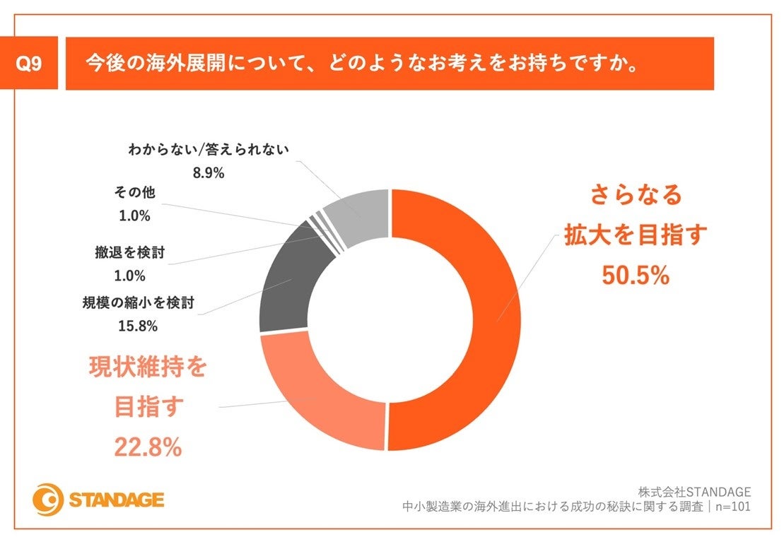 「Q9.今後の海外展開について、どのようなお考えをお持ちですか。」(n=101)と質問したところ、「さらなる拡大を目指す」が50.5%、「現状維持を目指す」が22.8%という回答となりました。