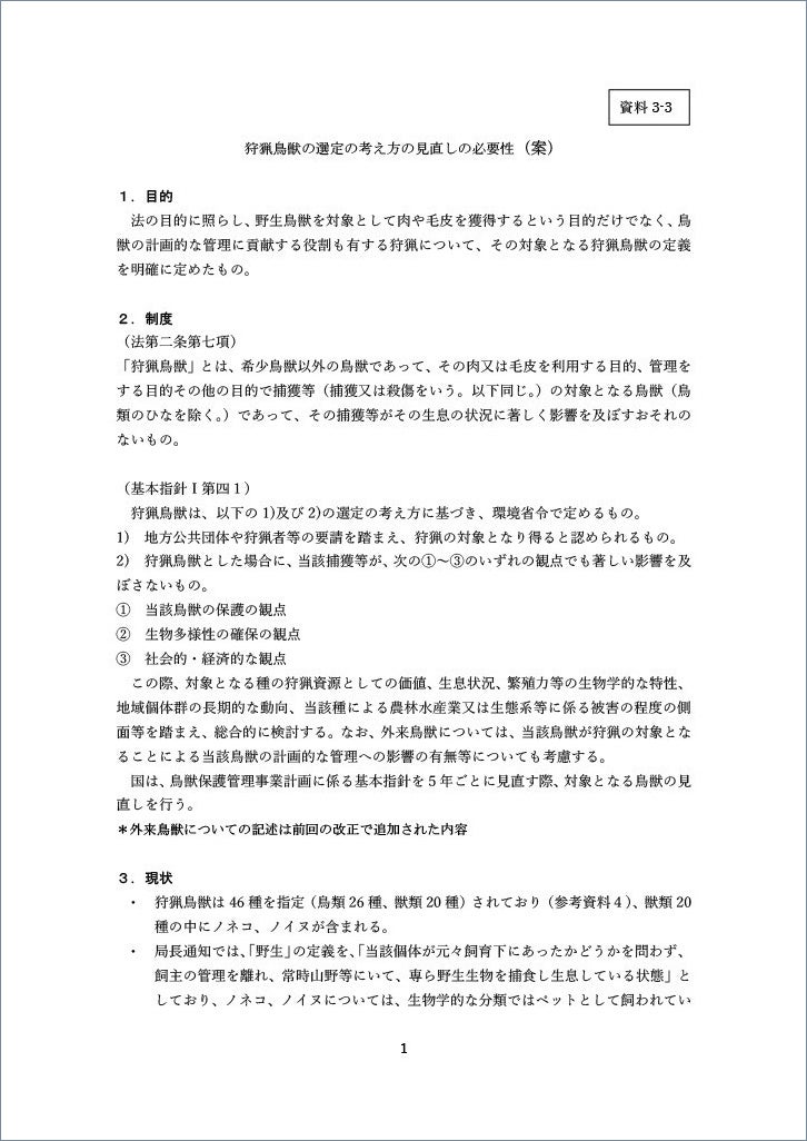 狩猟鳥獣の定義見直しに関する提案で、狩猟の目的や管理の観点からの考察を示す。