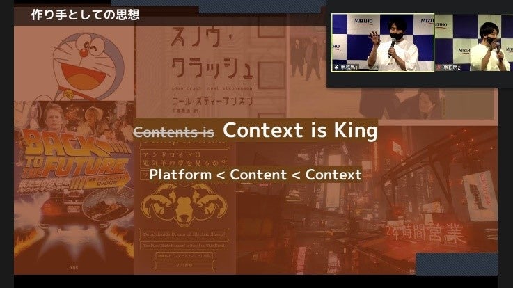 当社のミッションの一つである「メタバースエンターテインメント産業をつくる」や、作り手としての思想「Context is King」、当社の強みである「世界で評価されているIPプロデュース力」と「経験に基づいた技術基盤・運営ノウハウ」を掛け合わせて生まれる相乗効果について、約11分間のプレゼンテーションを行い、その後複数の質問に回答いたしました。