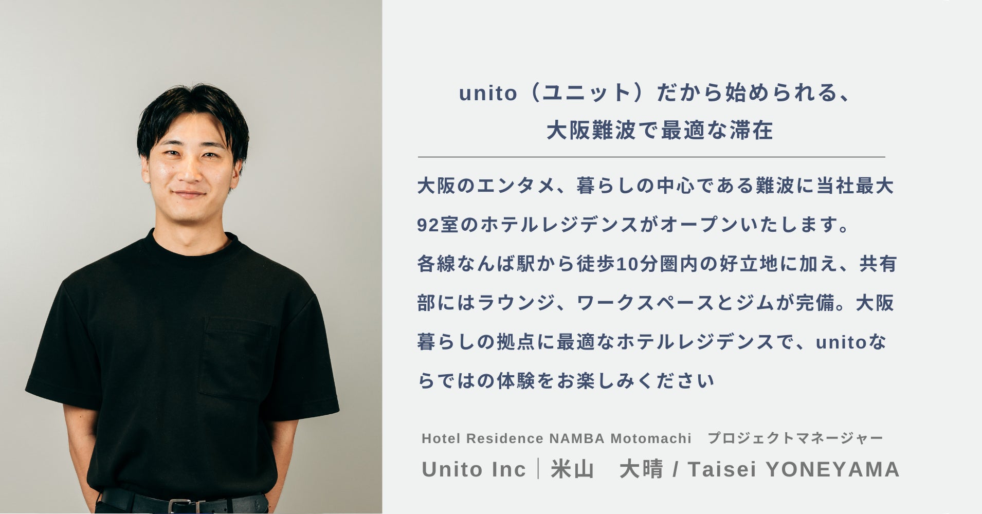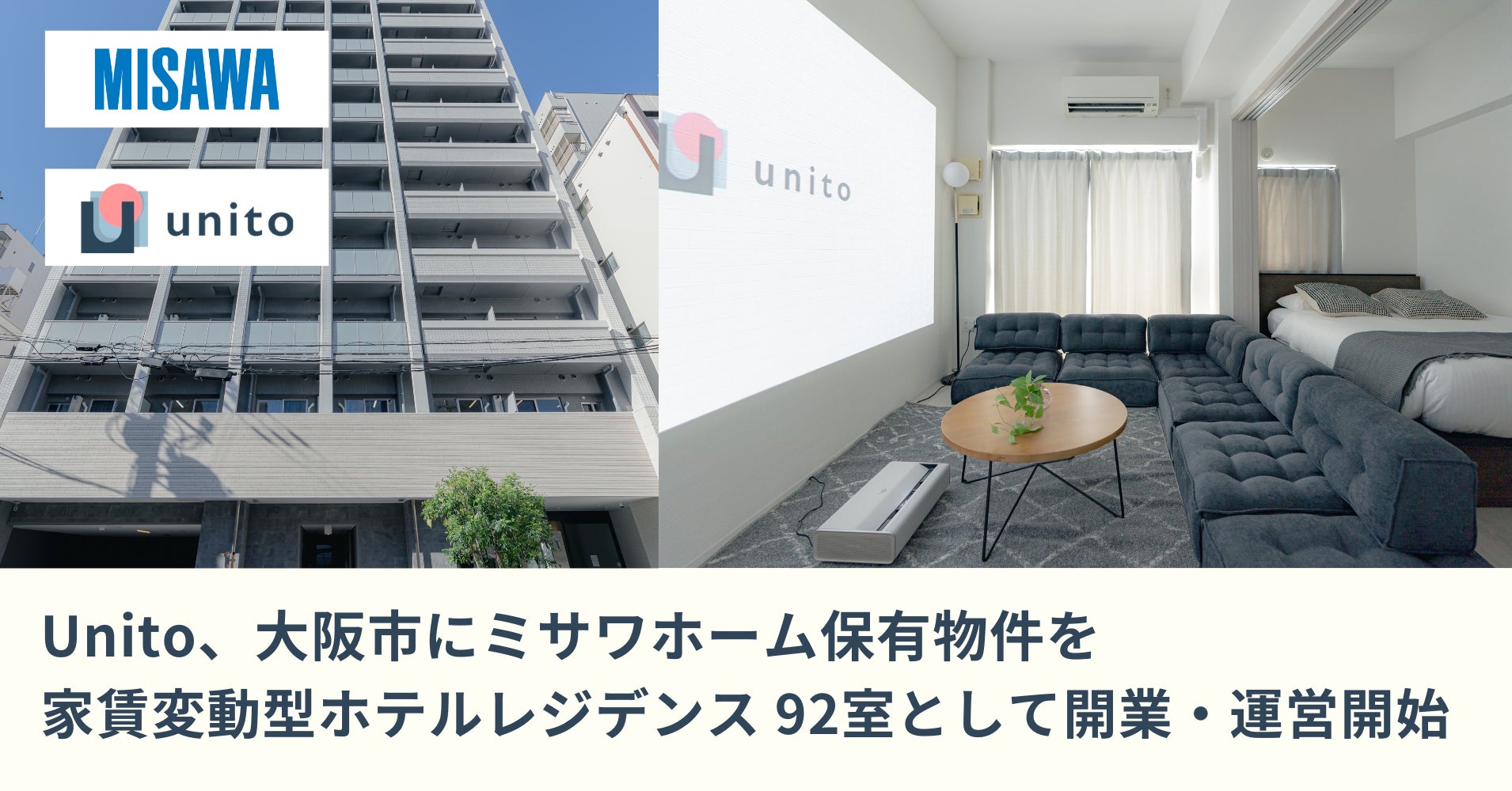 Unito(ユニット)、大阪市にミサワホーム保有物件を家賃変動型ホテルレジデンス「Hotel Residence unito NAMBA Motomachi」として開業、当社最大92室を運営開始。