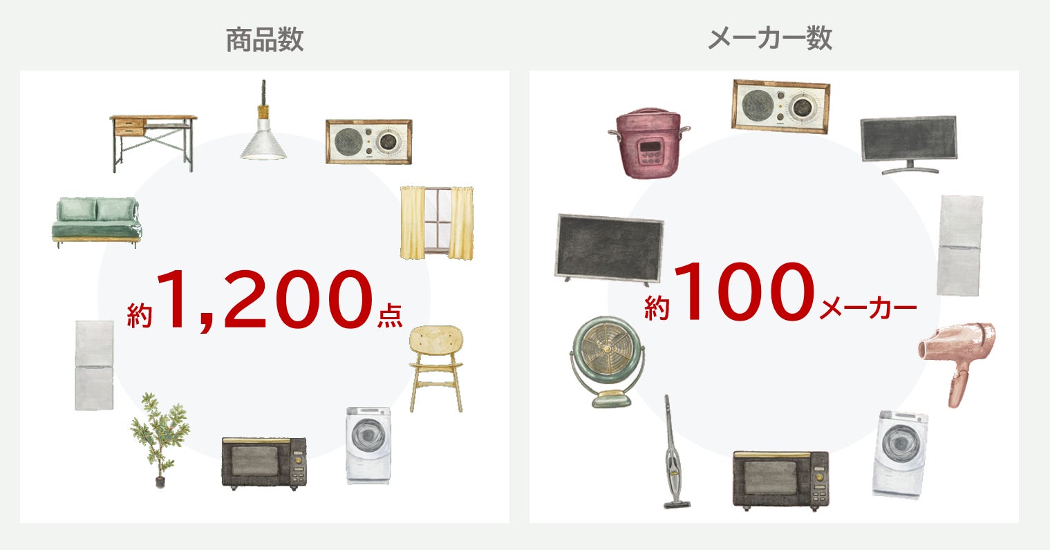 月々440円(税込)から家具・家電の利用・交換が行なえるサブスクリプションサービスです。個人・法人向けに、変化に応じた“最適空間”を提供。「交換手数料、返却手数料なし(送料・保証金も基本0円)」「最低利⽤期間なし(1ヶ⽉単位で気軽に利⽤可能)」「長く使うほどお得(2年目から20%OFF、3年目から50%OFF、4年目から80%OFF)」が特徴で、ライフスタイルに合わせて必要なときに必要なものをレンタル、不要になったら返却することで、より自由で手軽に家具・家電の導入が可能です。SDGsの目標12「つくる責任つかう責任」の達成に向け、循環型でサステナブルな「ものを捨てない社会づくり」の実現を目指します。
