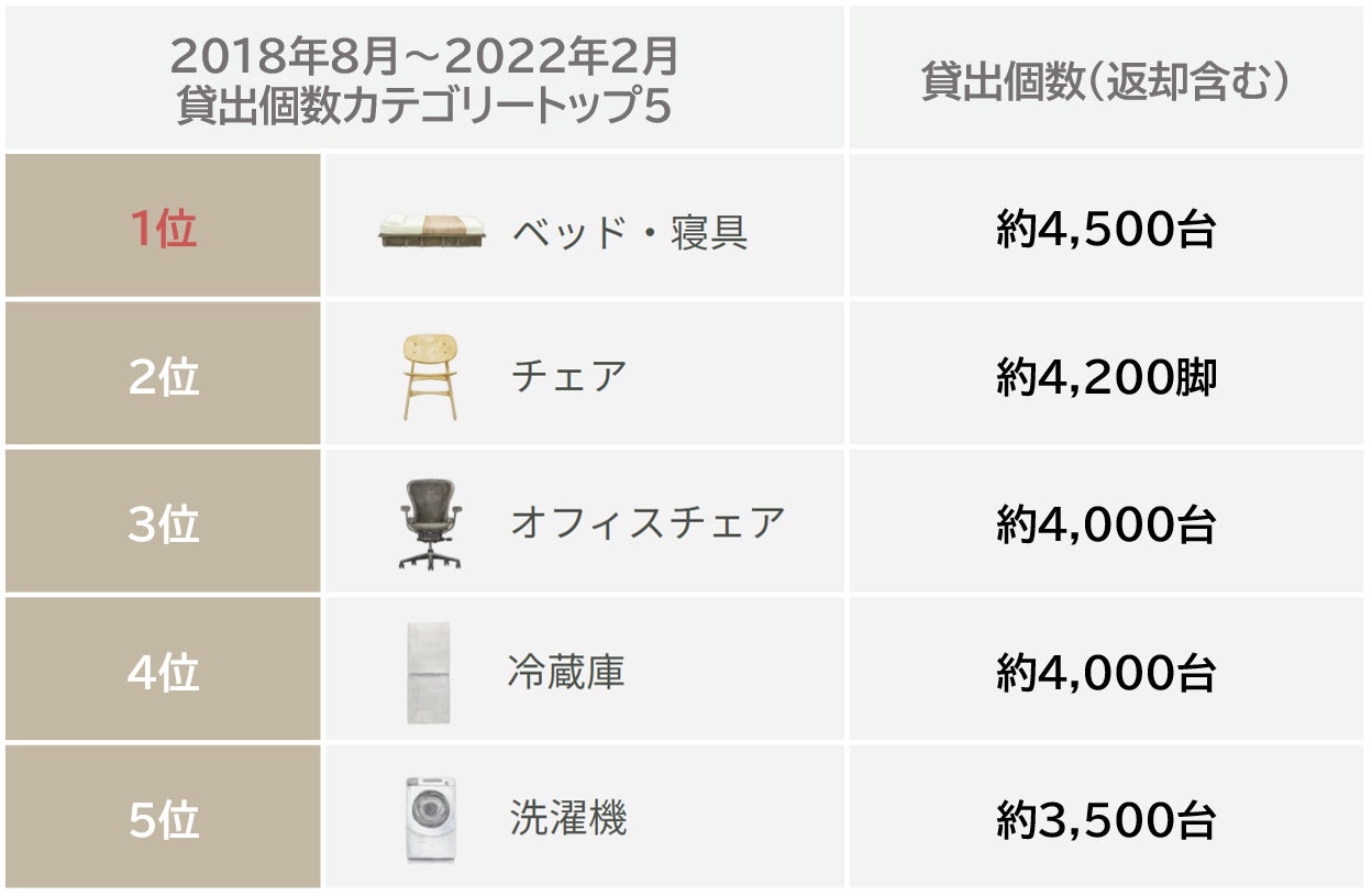 CLASでレンタルされている家具・家電の2018年8月〜2022年2月の上位カテゴリーは、ベッド、冷蔵庫、洗濯機といった生活必需品、かつ大型で重量のある家具・家電が上位を占める結果となりました。2020年からのテレワーク需要によるオフィスチェアの人気も根強く続き、自宅のワークスペースをアップデートする動きも見られました。