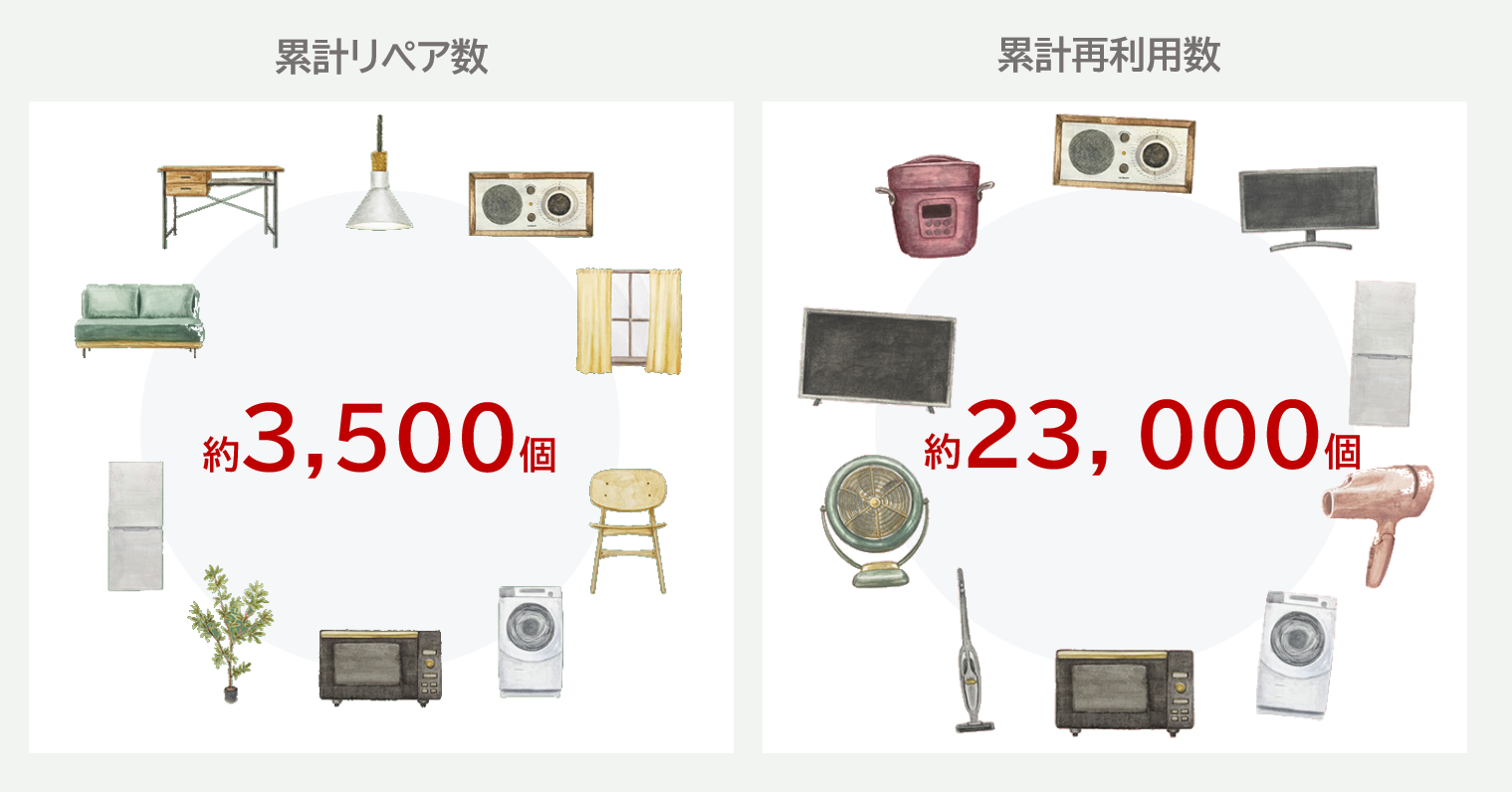 2022年2月までの累計リペア数は約3,500個、お客さまから返却後にクリーニングして再利用いただいた商品の累計は約23,000個。CLASでは、返却後に専門のリペア・クリーニングチームによって修繕やパーツ交換、リフレッシュなどを施し、新品同様によみがえらせた家具・家電を次のお客さまにお使いいただくことで、循環型の「所有しない利用」を促進。環境にやさしい、サステナブルな「ものを捨てない社会づくり」の実現を目指し、環境負荷軽減に取り組んでいます。