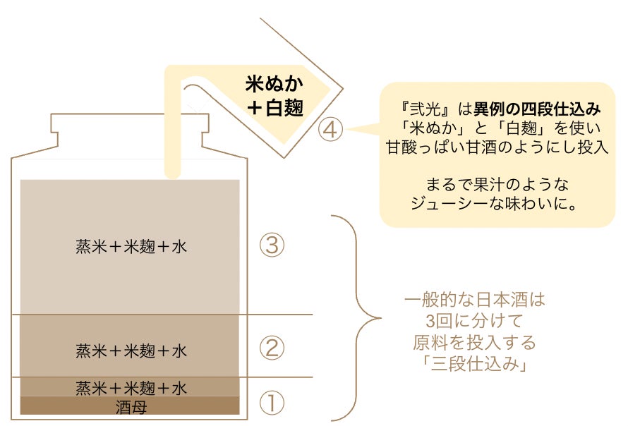 — 豊かな甘味を生み出す「四段仕込み」:多くの日本酒は米・麹・水を3回に分けて投入する「三段仕込み」によって醸造されますが、『弐光』は、そこからもう一度仕込みを行う「四段仕込み」で造られます。より多くの原料を用いる贅沢な醸造法で、リッチな甘味がもたらされます。