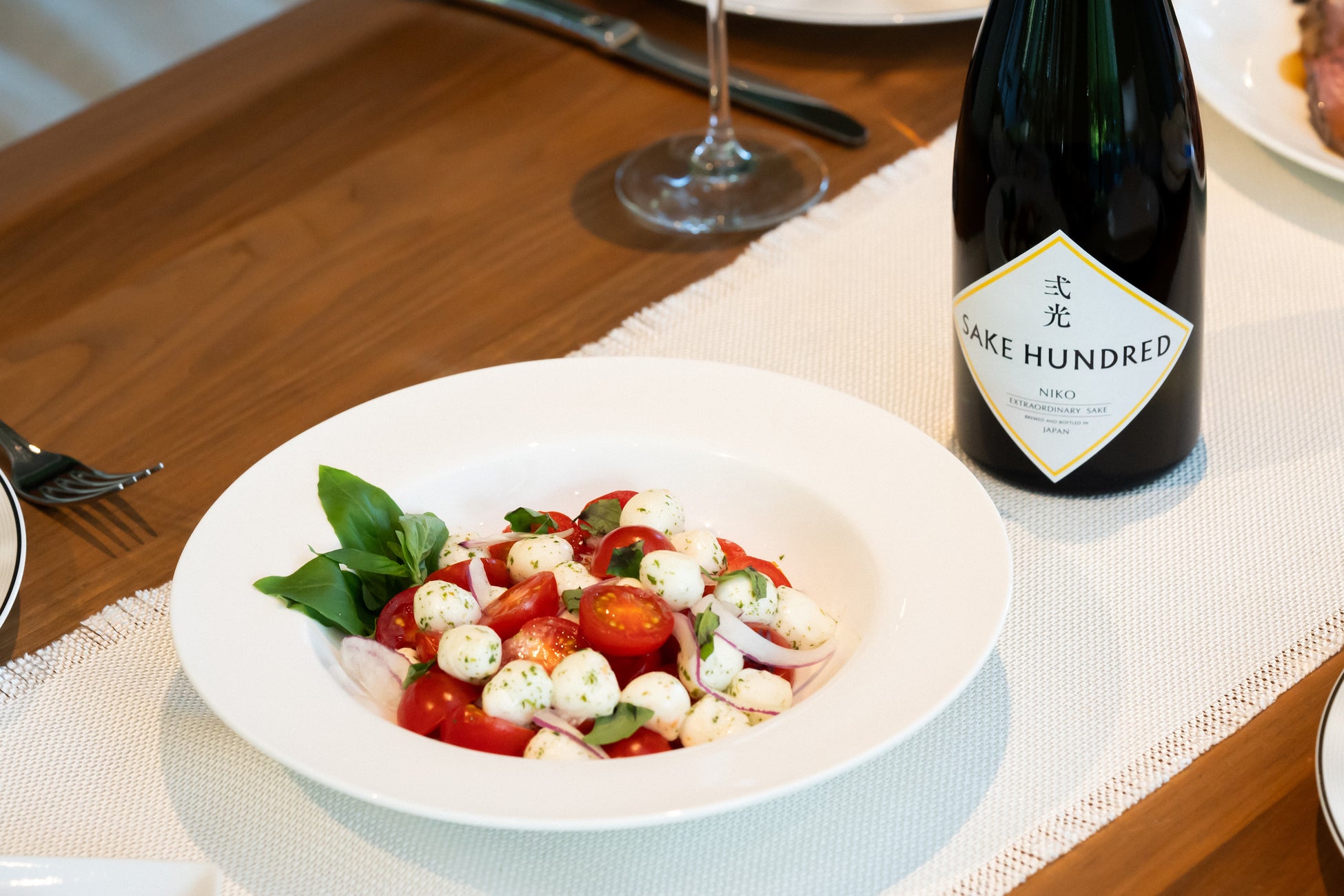 — トマトとモッツァレラのサラダ バルサミコソース:チーズのまろやかな質感、さらにはバルサミコソースの特徴的な酸が『弐光』の持つ個性的な質感・酸味とマッチします。