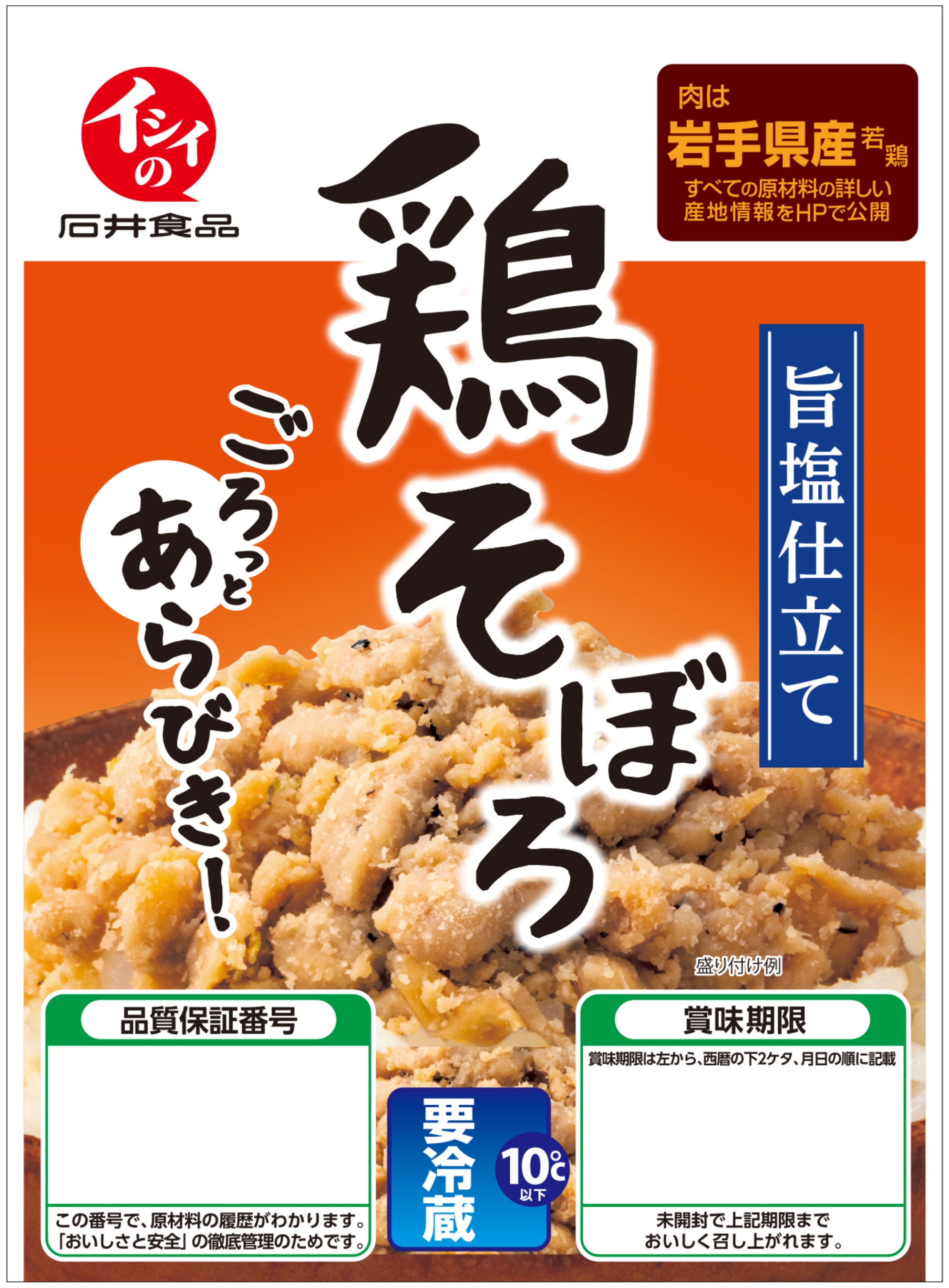 この商品は石井食品がすでにお弁当用として発売している「おべんとクン とりそぼろ」や、ごぼうが香る「有明鶏そぼろ ごぼう入り」とは異なり甘さが控えめになっていて、ピリッとコショウが効いた味付けになっています。また鶏肉を炒める温度・時間を調整することで、ゴロゴロとした鶏肉の食感を引き出していて、お弁当用のとりそぼろを卒業した中高生や大人の方の普段の食事でもおいしく使っていただける味付けとなっています。