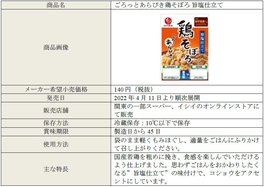 無添加調理※で商品作りを進めている石井食品株式会社(本社:千葉県船橋市、代表取締役社長執行役員:石井智康、以下、石井食品)は、食べ盛りのお子さまに向けた、袋を開けてすぐごはんにかけて食べることができる「ごろっとあらびき 塩鶏そぼろ 旨塩仕立て」を2022年4月11日(月)より期間限定で発売します。石井食品公式 無添加調理専門店 「イシイのオンラインストア」(https://shop.directishii.net/)では、すでに石井食品が発売しているとりそぼろとセットにした「3種そぼろ食べ比べセット」を発売します。