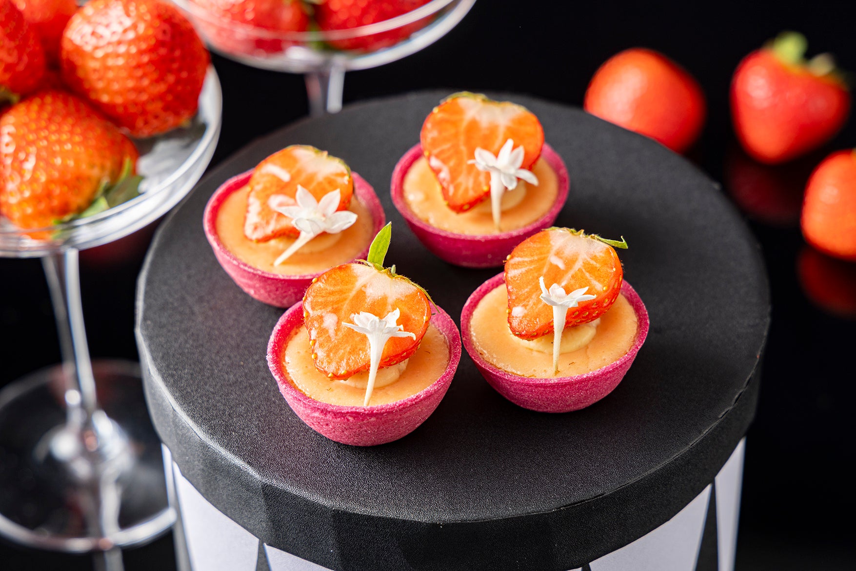 会場では、目の前で仕上げるライブステーションを設置し、2種類のストロベリースイーツをご提供します。「ストロベリークレープシュゼット」は、香ばしく焼き上げたクレープに、柚子がほのかに香るカスタードクリームを包み、温かいカラメル風味のいちごピューレをかけて仕上げる一皿。いちごの香りと酸味、カスタードの上品な甘さが絶妙なハーモニーを奏でます。「いちご大福」は、もちもちの求肥で、いちごとカスタードクリームを包み込んだ和洋折衷のスイーツ。一口で広がる素材の味と食感が、贅沢なひとときを演出します。