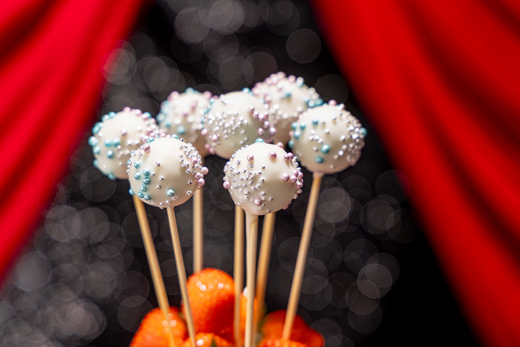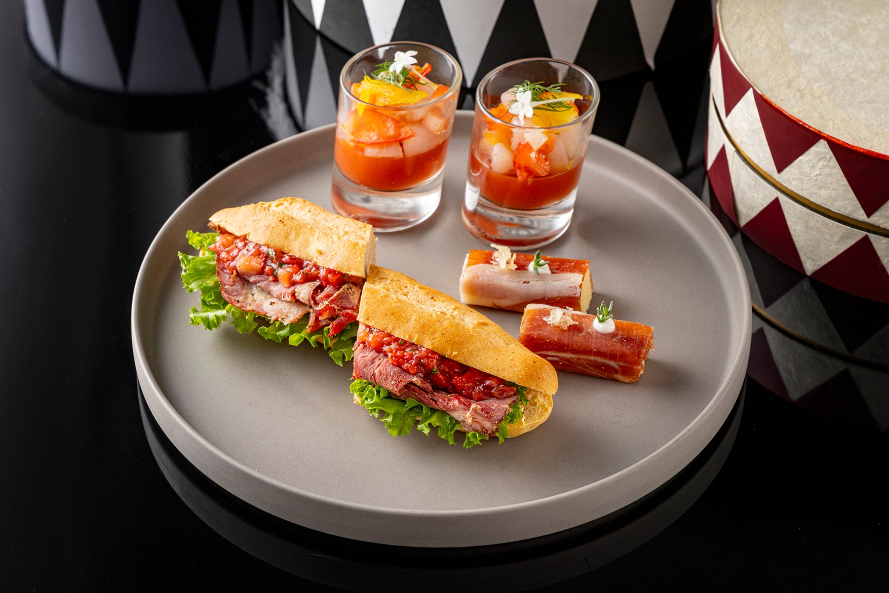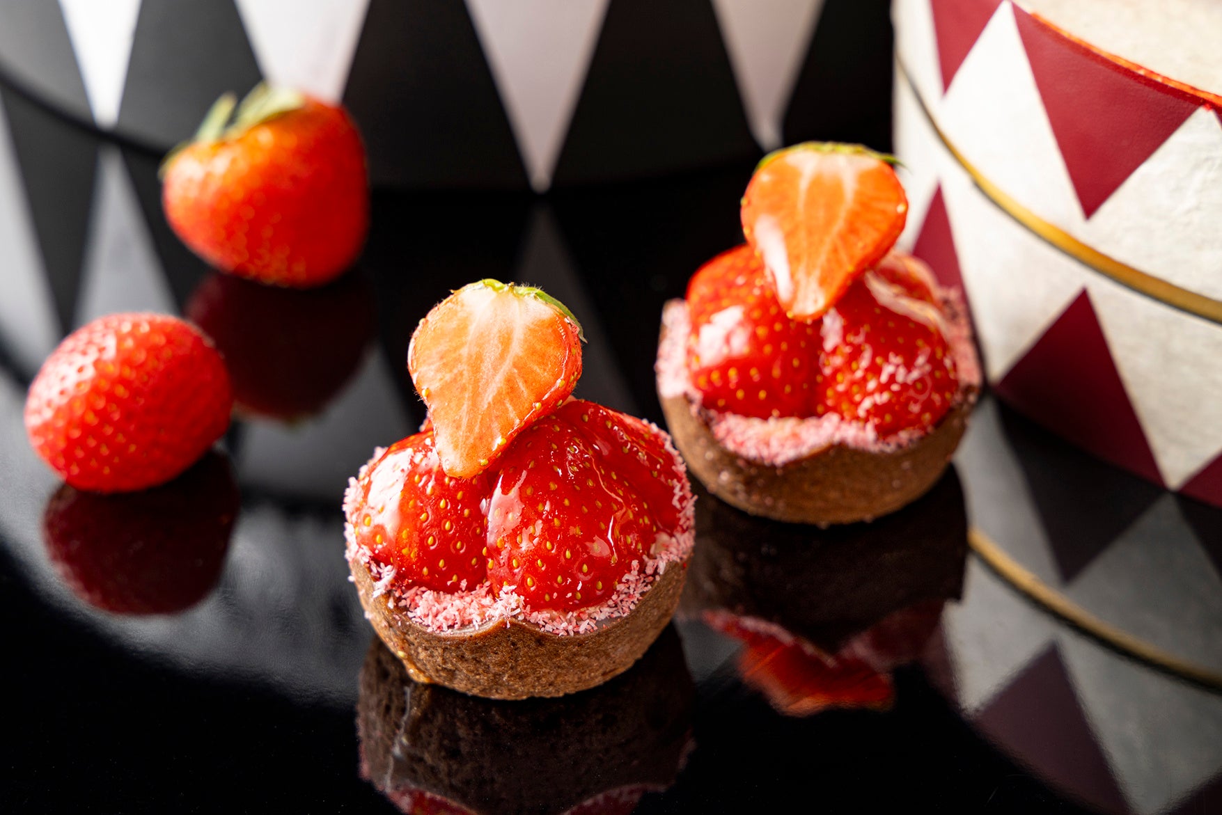 艶やかなルージュカラーのグレーズに包まれた、いちご型ムース。黒のベースに映える姿は、まるでパーティーの主役。