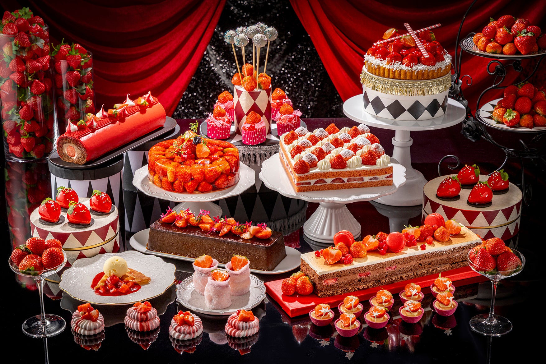 本ビュッフェは、スイーツ好きが心待ちにする「いちごの祭典」として、毎年ご好評をいただいている人気企画です。2026年のテーマは「The Secret Party」。パティシエの感性とインスピレーションから生まれた、ホテルメイドのストロベリースイーツが並ぶ、甘美で魅惑的な世界へお客様をお招きします。ドレスコードは“ルージュ&ノワール(赤と黒)”。情熱とエレガンスをまとい、非日常感あふれるティーパーティーをお楽しみいただけます。