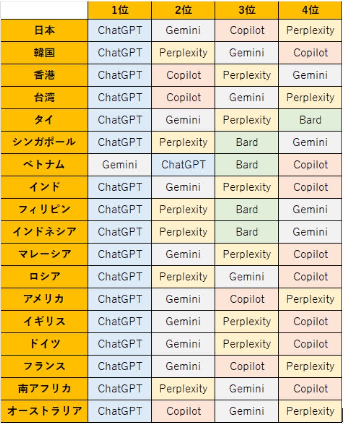 グローバルマーケティング事業(※1)を展開しているアウンコンサルティング株式会社(東証スタンダード市場:2459、本社:東京都千代田区、代表取締役CEO:信太明、以下「アウンコンサルティング」)はこの度、世界18か国・地域を対象に、2023年11月1日から2024年10月31日までの1年間における、主要な生成AIの検索ボリューム(※2)を調査しました。 この調査では、主要な生成AIツール(ChatGPT、Copilot、Gemini、Perplexity など)に焦点を当て、国・地域ごとの人気度や市場トレンドを明らかにしています。