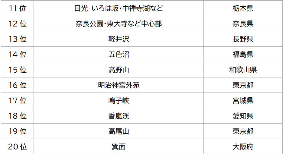 紙面に限りがあり、今回は20位までを掲載しました。多くのスポットが挙がったため、ランク外も紹介します。「昭和記念公園」「高源寺」「湖東三山」「永源寺」「寒霞渓」「高台寺」「三千院」「八幡平」「河口湖」「大原」・・このくらいにしておきます。