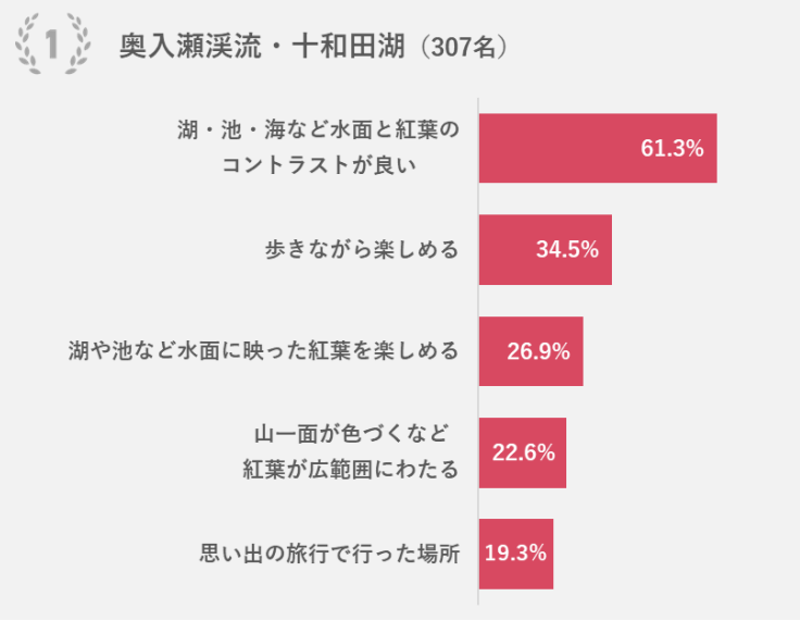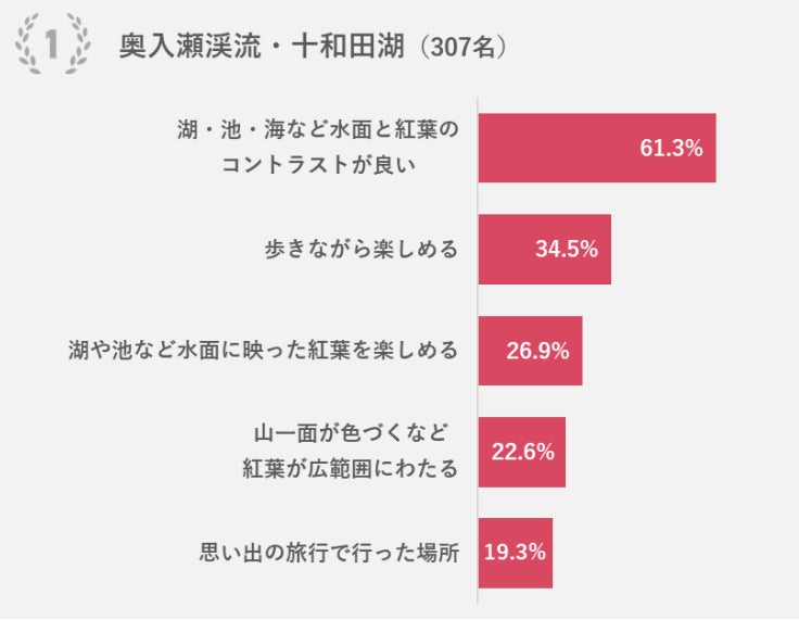 ・おすすめの理由は「湖・池・海など水面と紅葉のコントラストが良い」(61.3%)が圧倒的で、20スポット中最も高かった。2位は「歩きながら楽しめる」、3位には「湖や池など水面に映った紅葉を楽しめる」が入り、渓流沿いを散策しながら楽しめる点に魅力を感じる人が多かった。