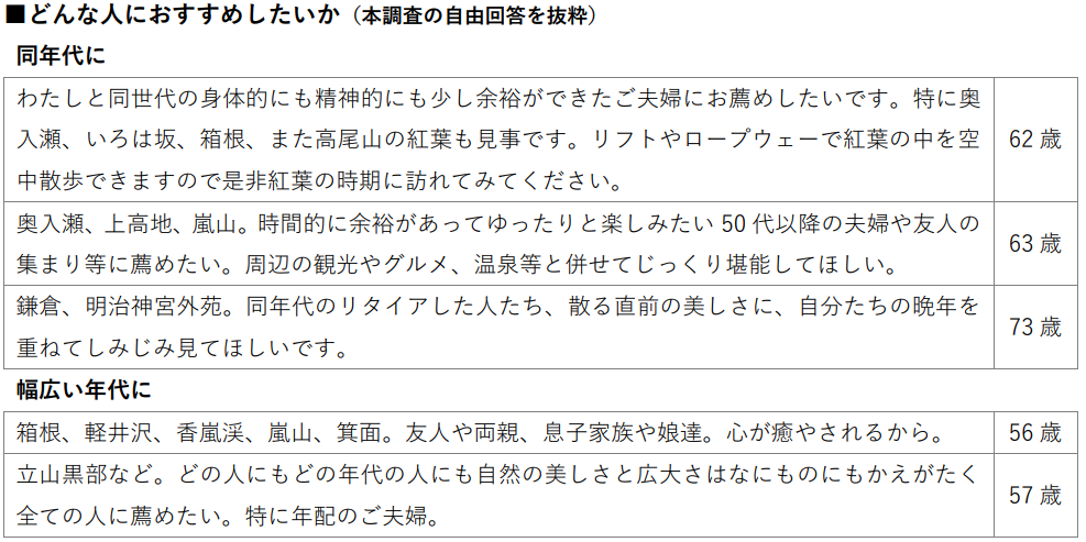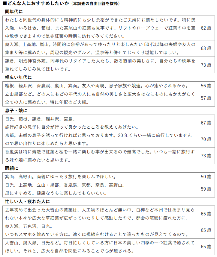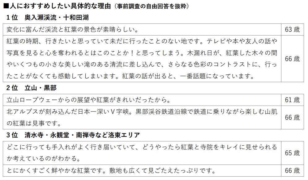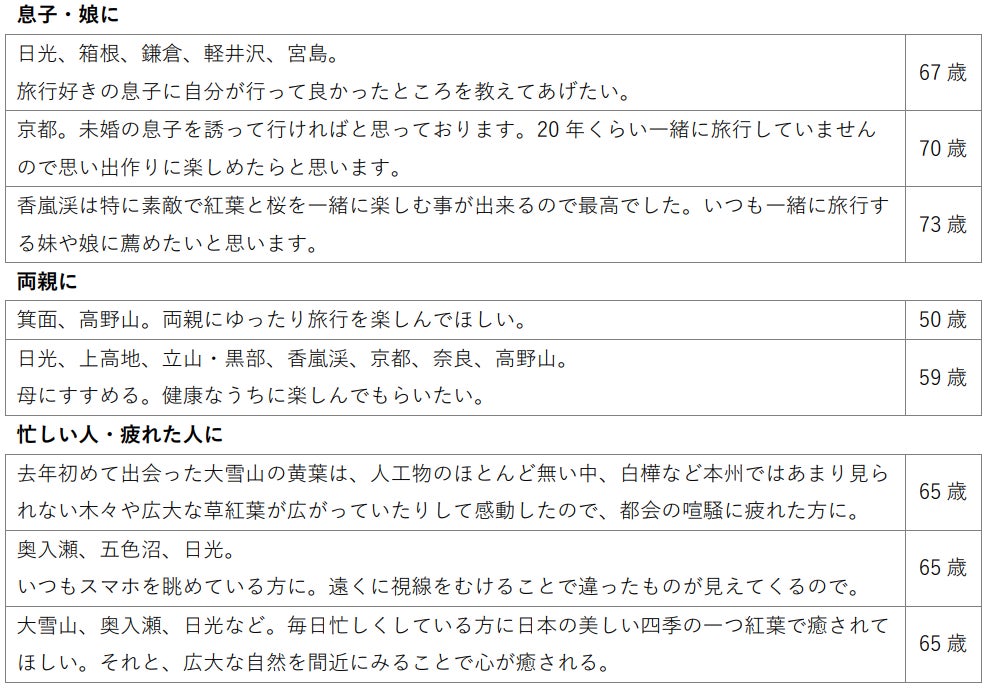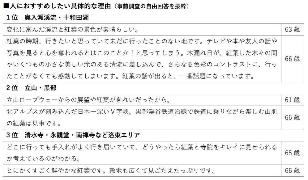 自由記述には、「湖・池・海など水面×紅葉」「神社仏閣・庭×紅葉」「空×紅葉」「紅葉×紅葉(山一面の色づき)」「光(木漏れ日など)×紅葉」など、色彩のコントラストを表現した美しい言葉であふれました。自然が織りなす壮大な芸術作品のように紅葉をとらえているのでしょう。