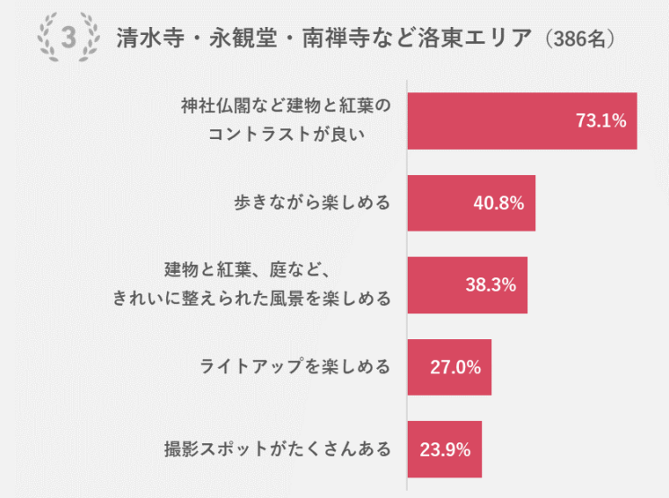 TOP2は「奥入瀬渓流・十和田湖」「立山・黒部」。冬は大雪に覆われるなど高頻度には訪れられないエリアです。圧倒的な大自然で、行った経験がある方は印象に残り、行ったことがない方もテレビなどで見ていつかは行ってみたい場所になっていました。「洛東・洛南・洛西エリアなど京都」の人気も高かったです。歴史的建造物とのコンビネーションがすばらしいと人工美が讃えられました。