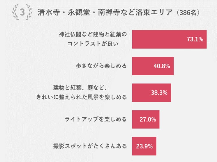・おすすめの理由1位は「神社仏閣など建物と紅葉のコントラストが良い」(73.1%)。2位は「歩きながら楽しめる」、3位には「建物と紅葉、庭など、きれいに整えられた風景を楽しめる」が入った。なお、ランキング4位の「東福寺など洛南エリア(京都府)」、6位「嵐山など洛西エリア(京都府)」、10位「鎌倉(神奈川県)」もおすすめの理由上位3位は同様だった。