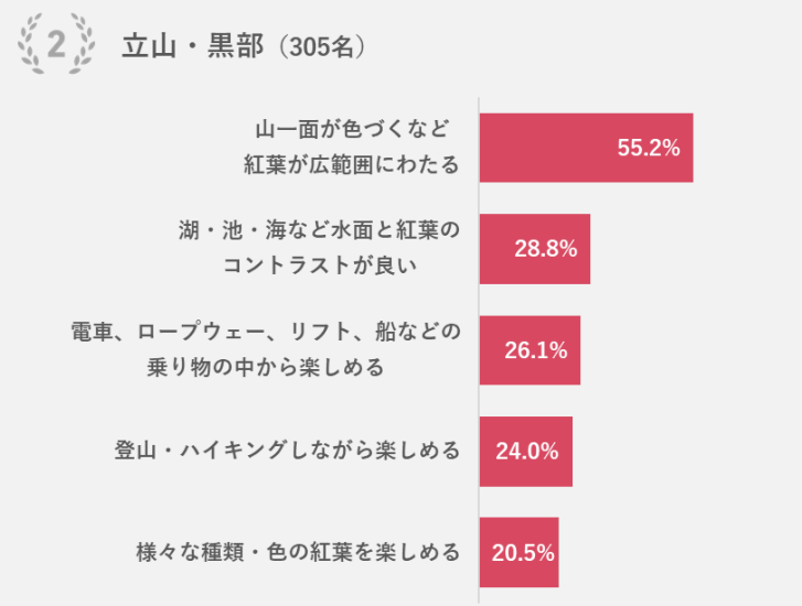 ・おすすめの理由1位は「山一面が色づくなど紅葉が広範囲にわたる」(55.2%)。2位は「湖・池・海など水面と紅葉のコントラストが良い」、3位は「電車、ロープウェー、リフト、船などの乗り物の中から楽しめる」。乗り物で移動しながら標高の異なる山岳風景を鑑賞できる点が魅力に感じられた。