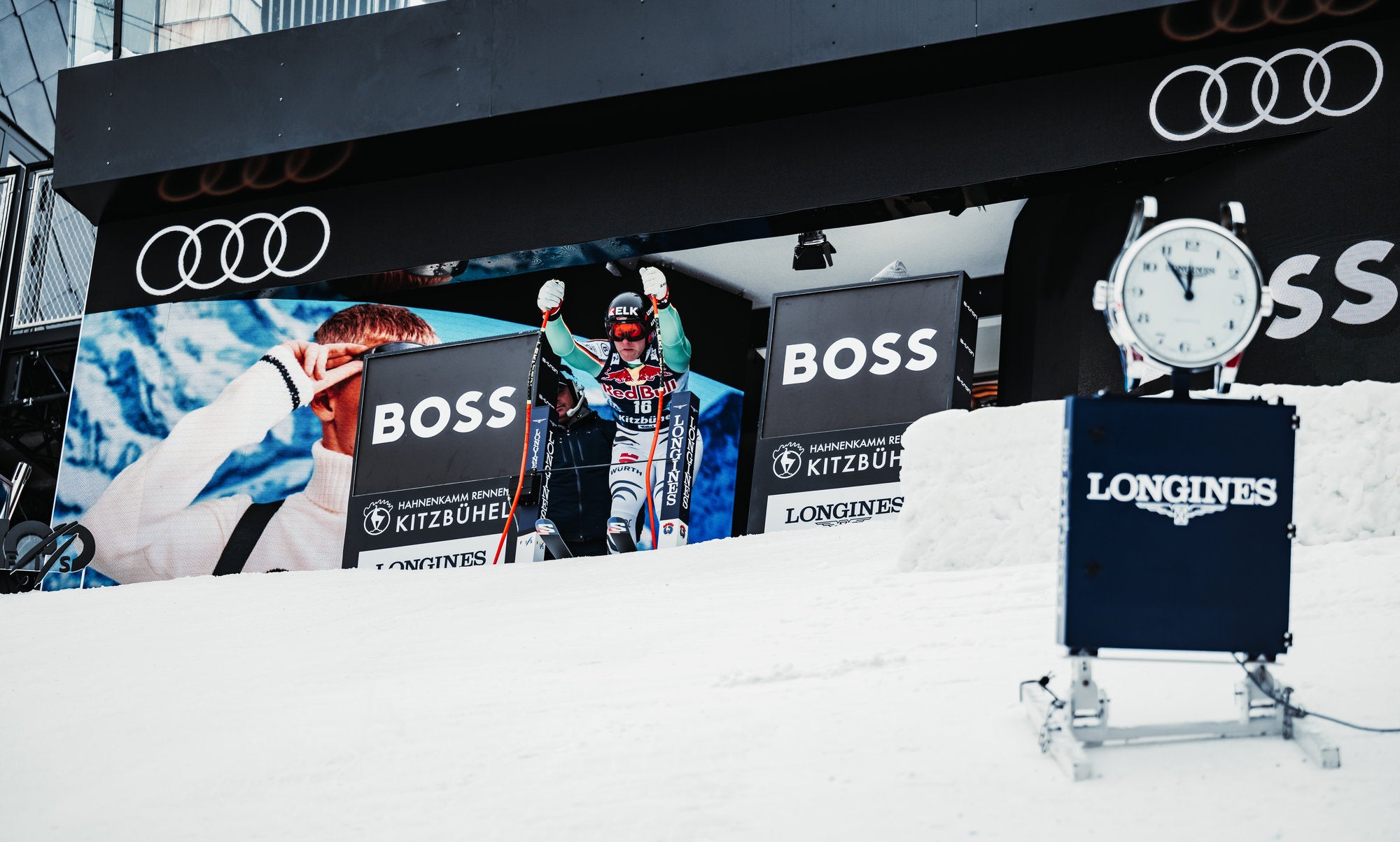 見逃せないほど大胆に展開したBOSSのブランディングは、ゲレンデを滑るスキーヤー、準備ゾーン、コース上、ビデオ壁面、そしてフィニッシュ・エリアにてフィーチャーされました。BOSSからのメッセージは、グランドスタンドでも目を引くダウンヒルの競技にてLEDサイネージで展開。さらに、今年もBOSSの熱気球が山頂の上空を舞いました。