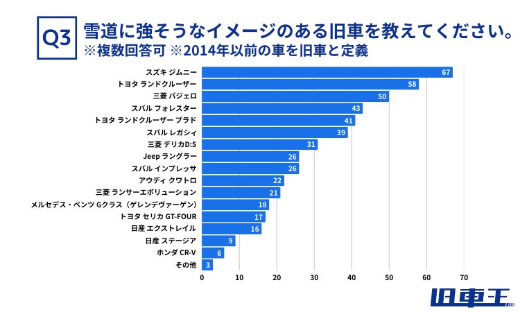 回答結果から、雪道に強そうなイメージを持たれる旧車として特に人気が高かったのは「スズキ ジムニー」(67票)で1位でした。コンパクトな軽自動車でありながら、優れた四輪駆動性能とオフロード性能を持つジムニーは、雪道でも安心して走行できる車として幅広い支持を集めています。2位の「トヨタ ランドクルーザー」(58票)や3位「三菱 パジェロ」(50票)も、悪路走破性に優れるSUVとして長年の実績があり、雪道対応力の高さが評価されていると考えられます。