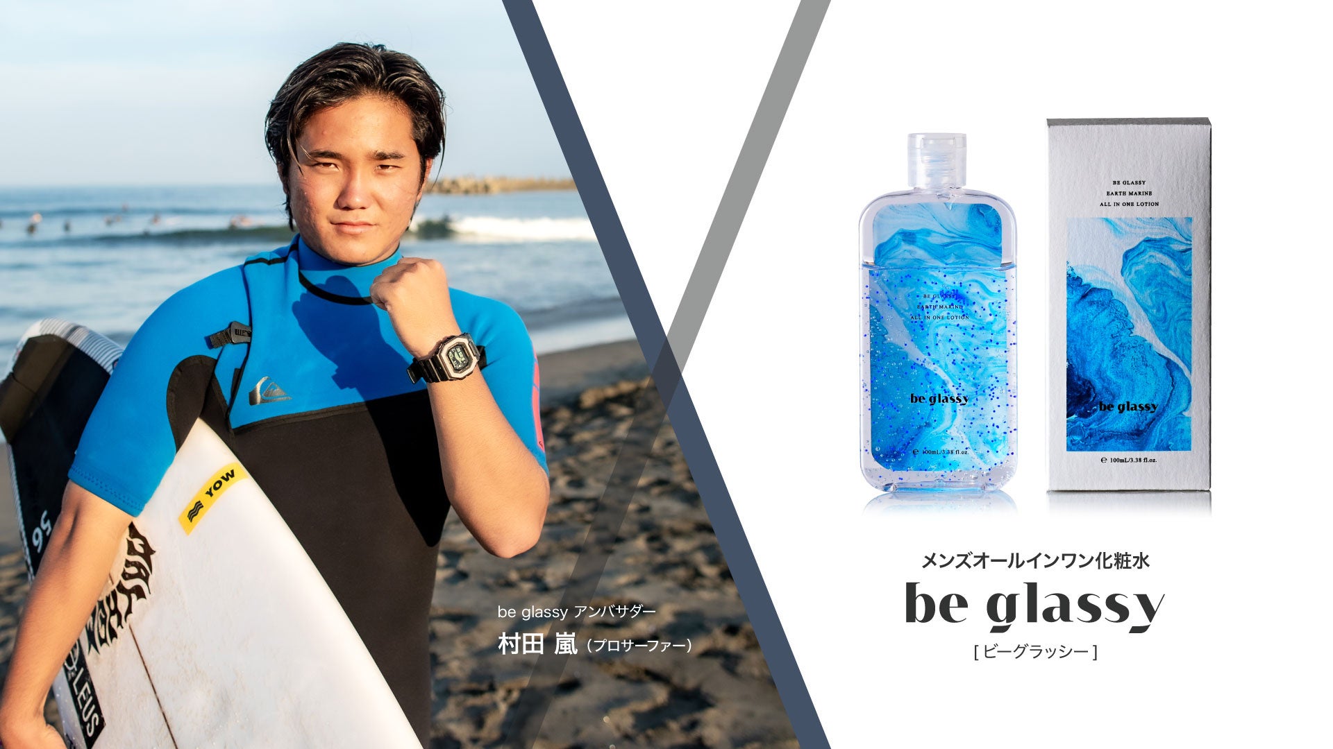 1本5役の男性向けスキンケアアイテムの『be glassy(ビーグラッシー)』、プロサーファーの村田嵐選手とスポンサー契約締結
