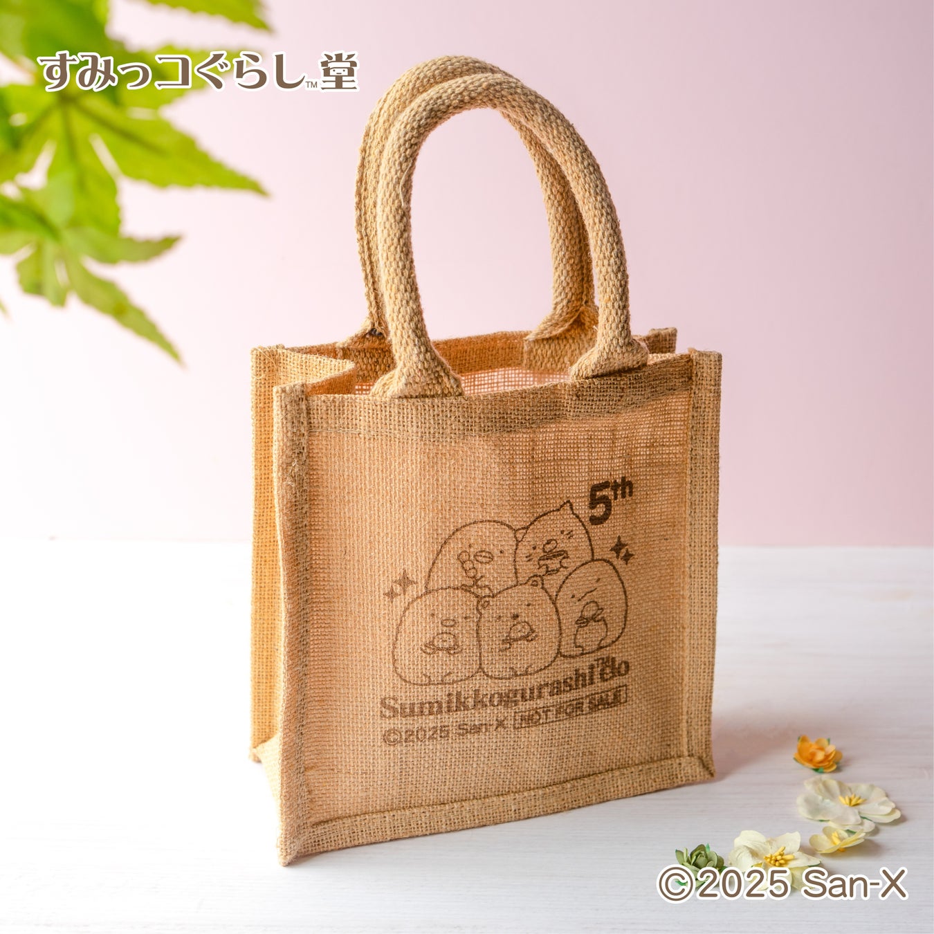 すみっコぐらし堂5周年記念デザインをあしらった、特別仕様のジュートバッグです。