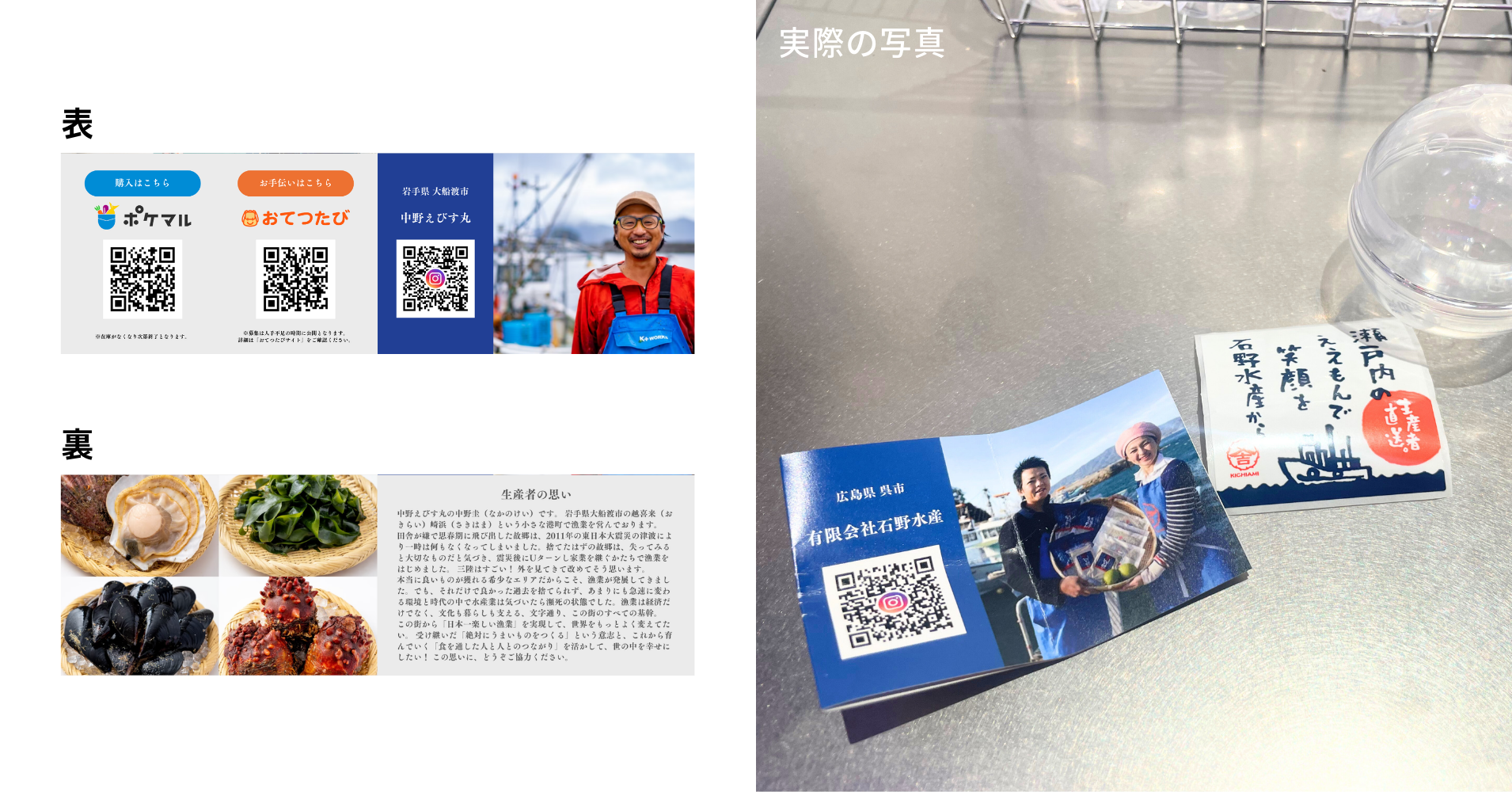 カードには、生産者の想いが綴られているだけではなく、生産者の産品が購入できる産直アプリ「ポケットマルシェ(ポケマル)」への導線や、お手伝い旅ができる「おてつたび」への導線も記載しています。
