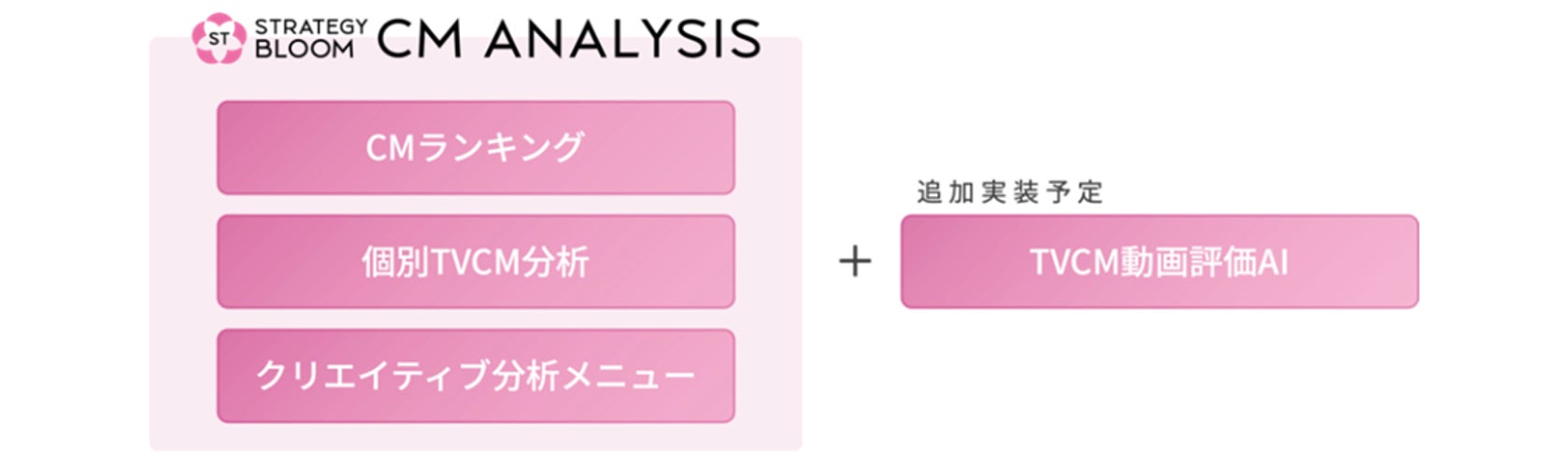 今後、TVCM動画から広告効果予測を行うTVCM動画評価AI(特許出願中)の実装を予定しています。本機能を実装することで、過去に放送されたTVCMの広告効果に関する要因分析等の高度化を実現するだけでなく、制作過程の動画に対する広告効果の事前予測が可能となります。クリエイティブ制作フェーズを支援するCREATIVE BLOOMのプロダクトとシームレスに連携する事で、より効率的なクリエイティブ制作PDCAの実現を目指します。
