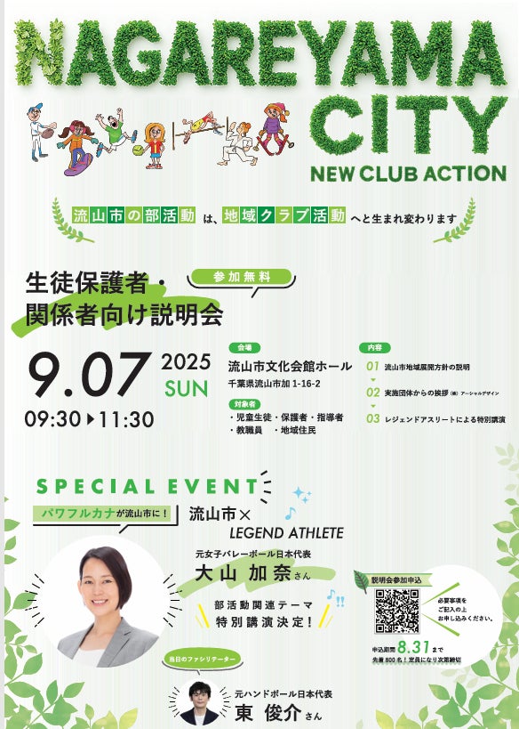 流山市教育委員会、9月7日(日)に元女子バレーボール日本代表 大山 加奈氏を特別ゲストに迎え、部活動地域展開における市内説明会を開催!