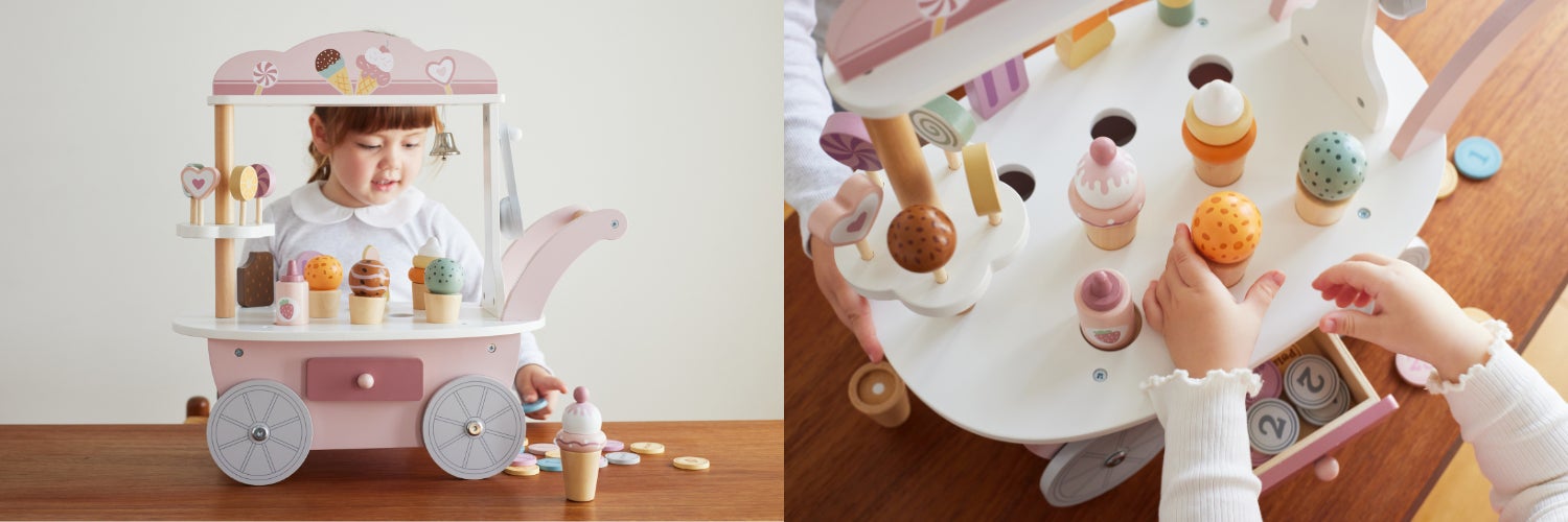 アイスにコーン、スクープ、コインと、たくさんのアイテムが揃ったセット。アイスとコーンは自由に組み合わせられるので、遊びの幅が広がります。カートの引き出しにコインを入れて、お会計ごっこをすることも。楽しく数字にふれられます。