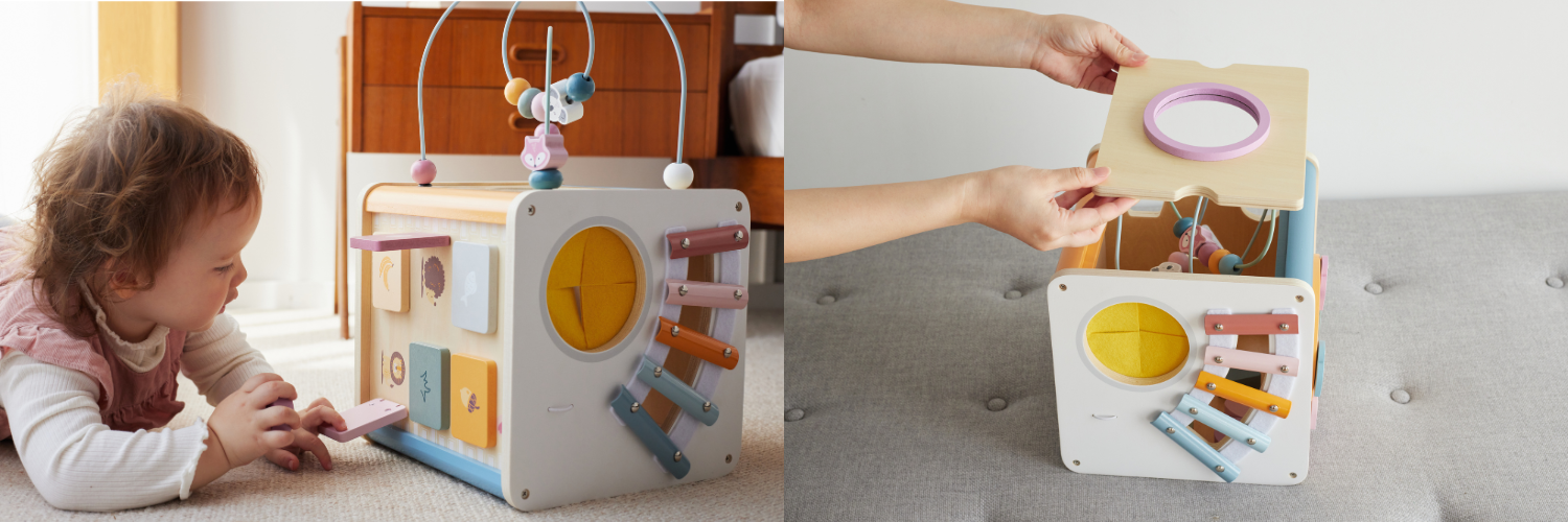 鉄琴、観覧車、型はめなど、8つのしかけをつめこんだアクティビティボックス。指先を使って遊びながら、様々な色や形にふれましょう。ルーピング部分をひっくり返してコンパクトに収納可能です。