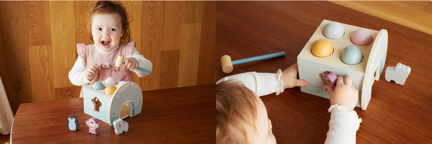 氷のドームをモチーフとしたハンマーゲーム。ハンマーでボールを叩いてみましょう。ころんと落ちてくる様子や音が繰り返し遊びたくなるポイント。キャラクターのブロックで型はめやごっこ遊びも楽しめます。