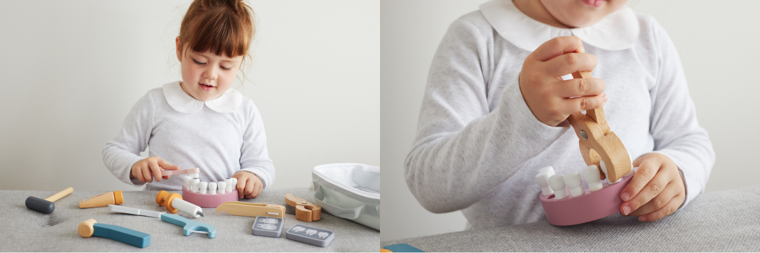 ぺンチ、ドリル、ミラー、注射器など、歯医者さんごっこが楽しめるセット。虫歯をペンチで抜いて、キレイな歯に入れ替えられるしかけも。遊びながら歯の大切さを学びましょう。ポーチ付きでお片づけも楽々です。