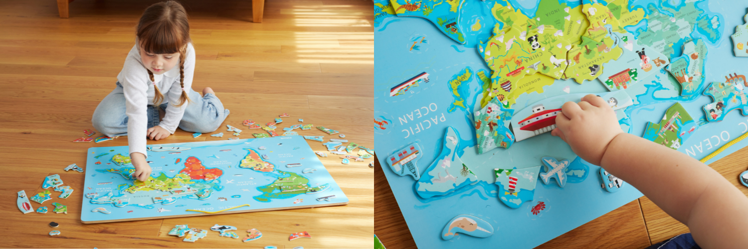 106ピースのマグネットパズル。世界地図を完成させながら国名や特長を学びましょう。幅72センチの大きめサイズなので家族やお友だちと一緒に楽しむこともできます。壁掛け用の紐付きで、子ども部屋のインテリアにもぴったりです。