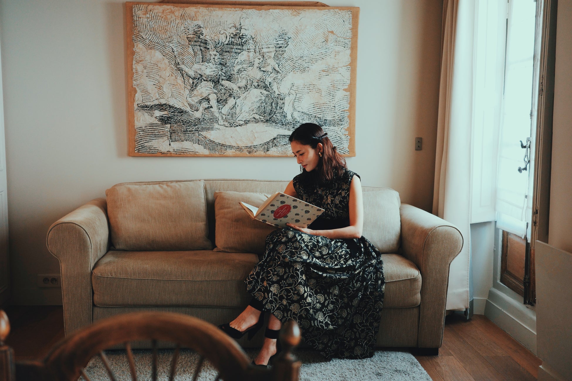 予定を詰め込まず、何もない1日を作ること。カフェや公園で本を読みながら道行く人々を眺める贅沢な時間には、ゴールドの箔プリントが施されたデザインのブラックワンピースをまとって。シノワズリなムードを醸し出しつつ知的な色気を演出します。