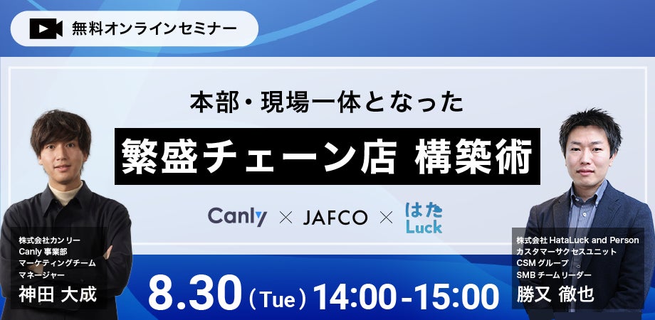 Googleビジネスプロフィール(旧・Googleマイビジネス)・HP・各SNSの一括管理サービス「Canly(カンリー)」の開発・提供を行う株式会社カンリー(所在地:東京都渋谷区、代表取締役:辰巳 衛,秋山 祐太朗)は、2022年8月30日(火)に株式会社HataLuck and Personとの共催ウェビナー『本部・現場一体となった〜繁盛チェーン店 構築術〜』を開催することとなりましたのでご案内いたします。