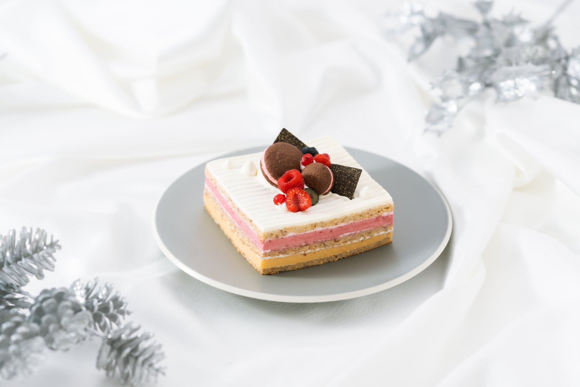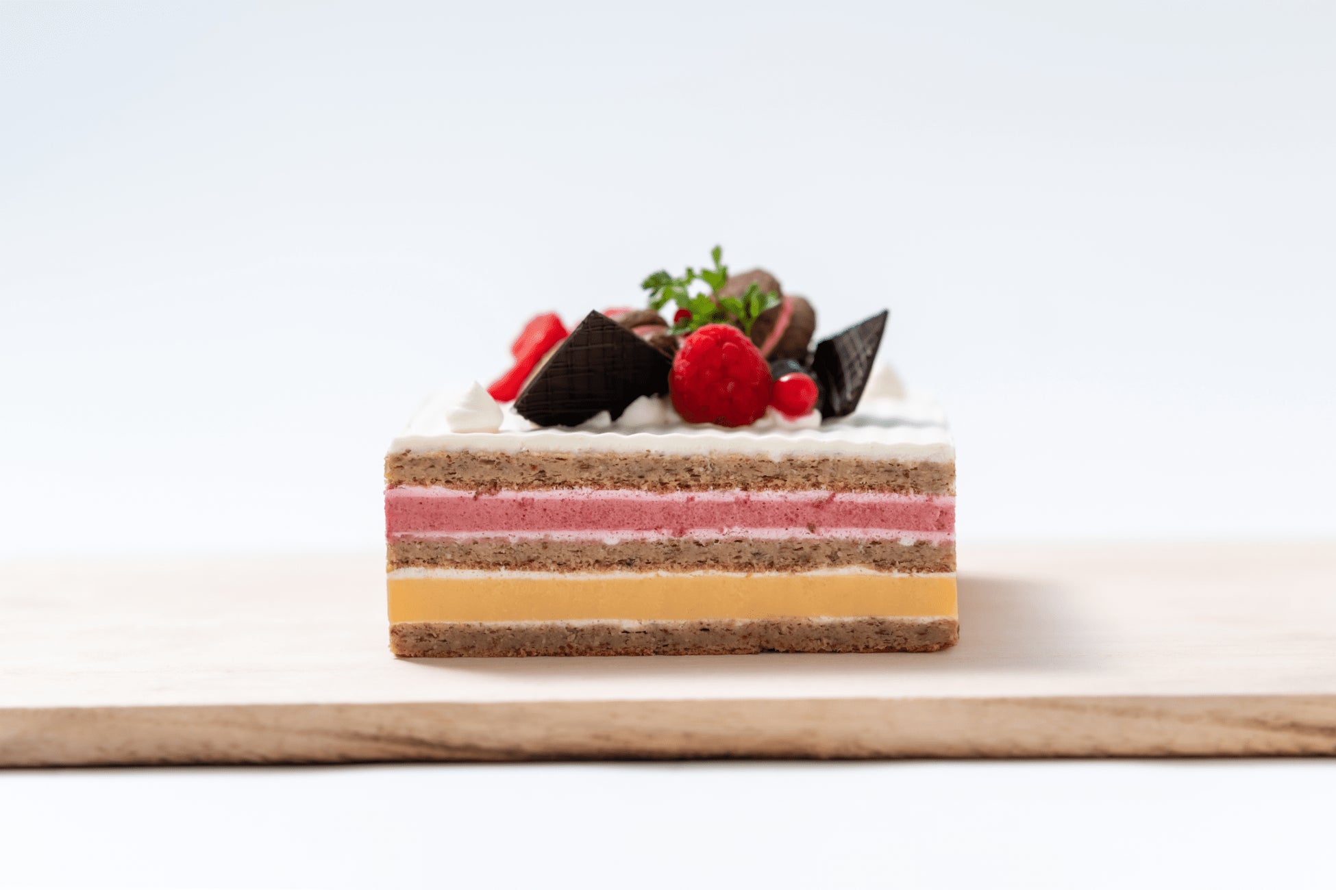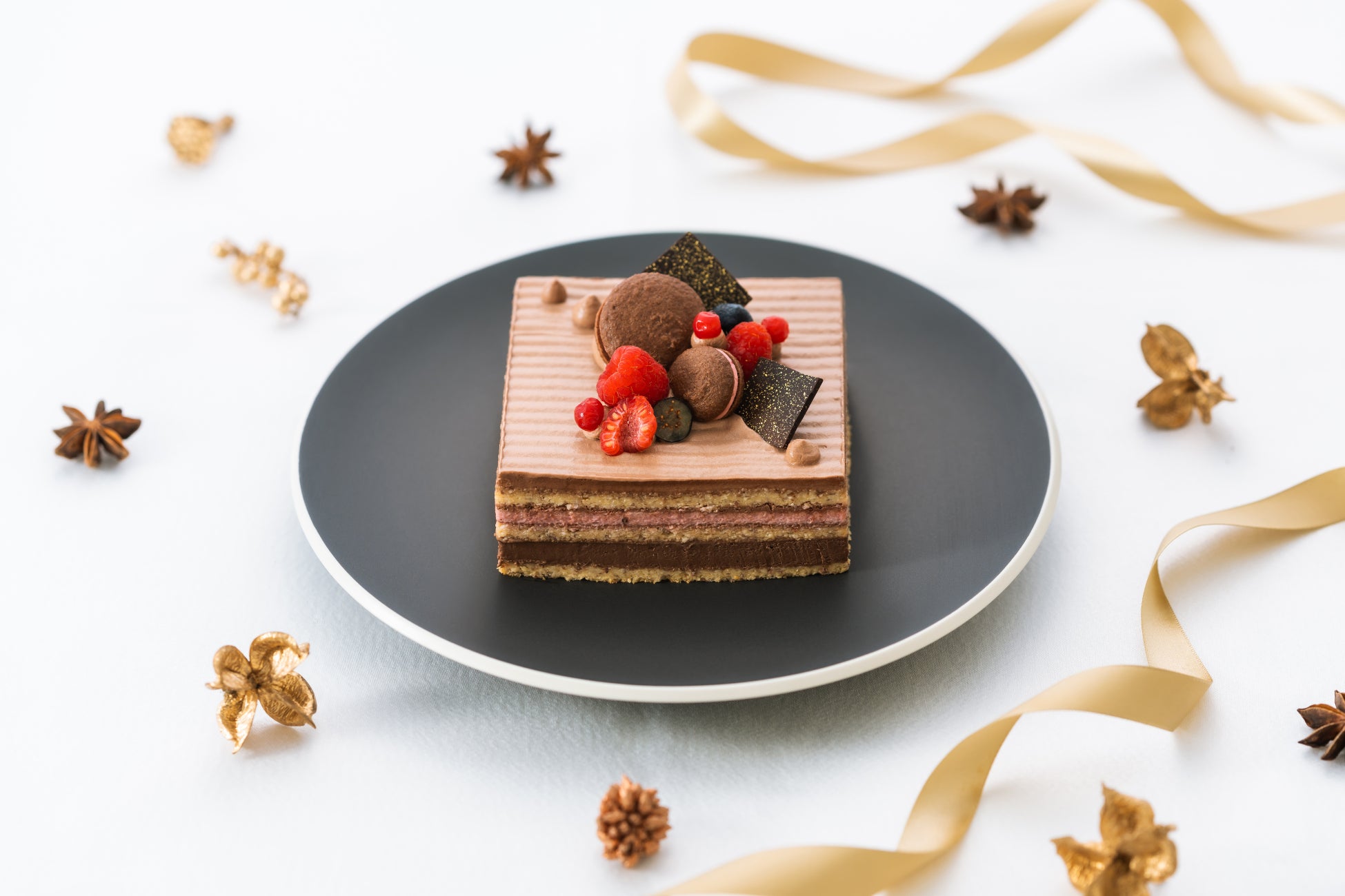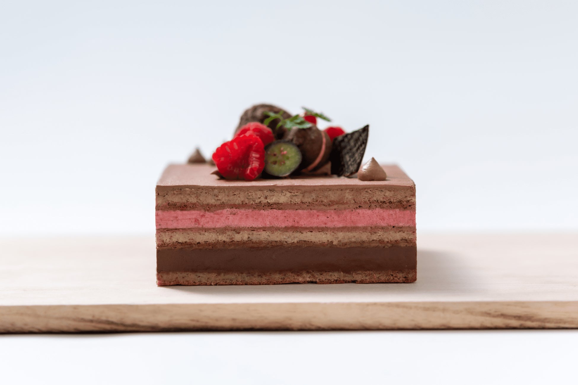 チョコレートクリーム(北海道産生クリームを使用)、アーモンド生地、ラズベリームース、平飼いの卵と有機牛乳を使用したチョコレートカスタードクリームを10層に重ね合わせました。