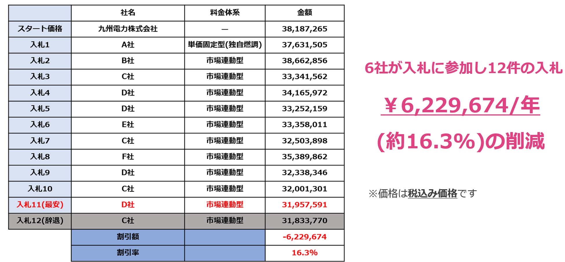 別府市では、電力価格の高騰に伴う料金体系の複雑化により、従来の入札プロセスでの電力調達業務が難しくなっていることが問題となっていましたが、今回リバースオークションを行った結果、計6社から件の入札があり、再エネ化だけでなくコスト削減も実現することができました。