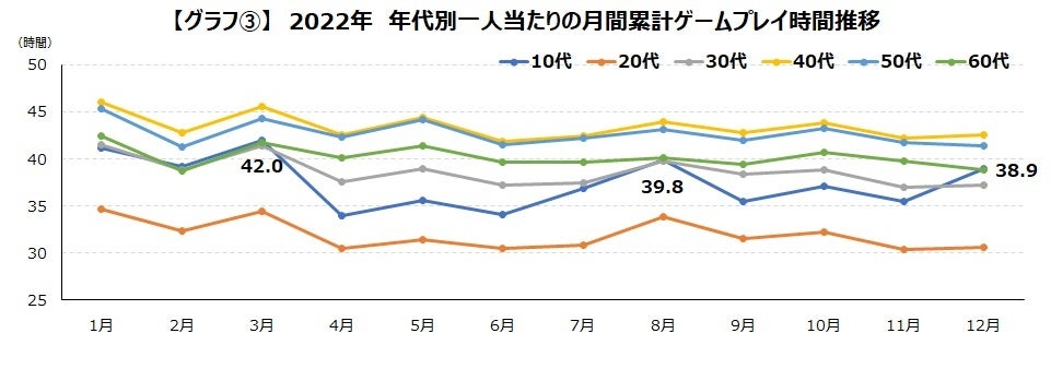 全世代で比較すると、30代以上は各月のゲームプレイ時間に大きな変化は見られませんが、10代と20代は時期によりゲームプレイ時間が大きく変化しています。
