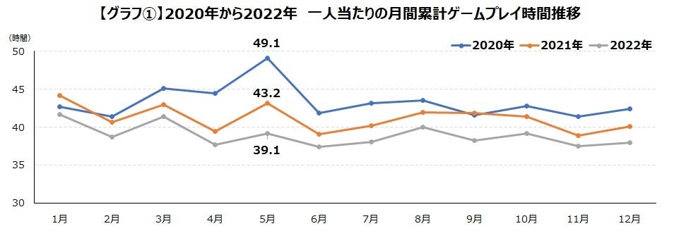 その後の2年間のゲームプレイ時間は、明確に右肩下がりのトレンドが確認できます。2022年は過去2年と比べ全ての月で一人当たりの累計プレイ時間が短くなり、ほとんどの月で40時間を下回りました。