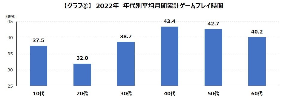 ひと月あたりの累計ゲームプレイ時間の平均が最も長かったのは40代の43.4時間。その次に50代の42.7時間、60代の40.2時間と続きます。逆に最も少ないのは20代の32.0時間となっています。【グラフ➁】