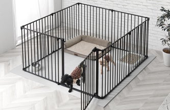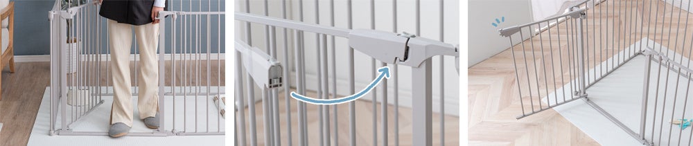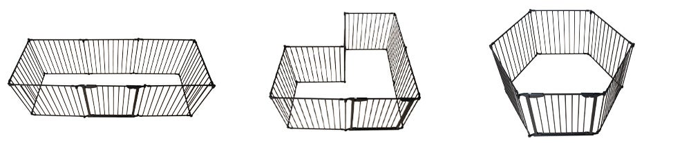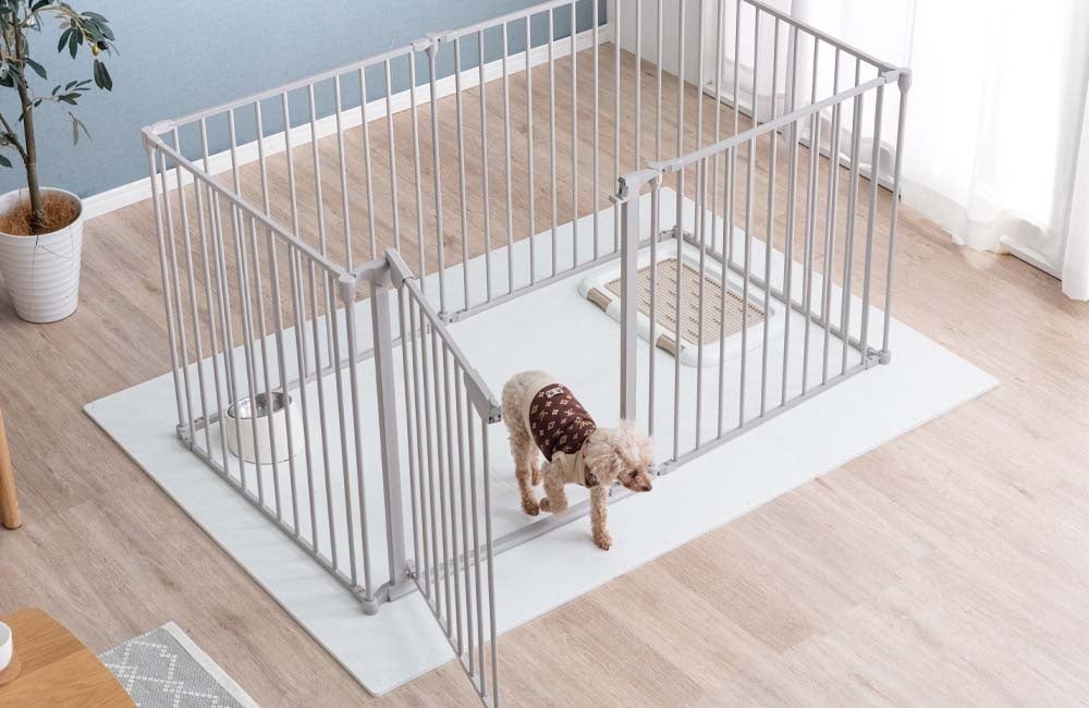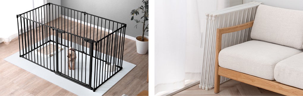 本製品はそれぞれのパネルを取り外してご使用いただくことができ、愛犬の成長やお部屋のサイズに合わせた自由なレイアウトが可能です。愛犬が小さい頃は4枚のパネルのみを使用して小さな正方形の形で使用し、成長して大きくなったらすべてのパネルを用いた大きなレイアウトに変えることもできます。