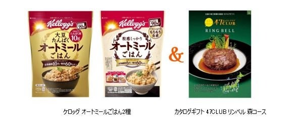 賞品:ケロッグ オートミールごはん2種(大豆たんぱく オートミールごはん、粒感しっかり オートミールごはん)と「カタログギフト 47CLUB リンベル 森コース」