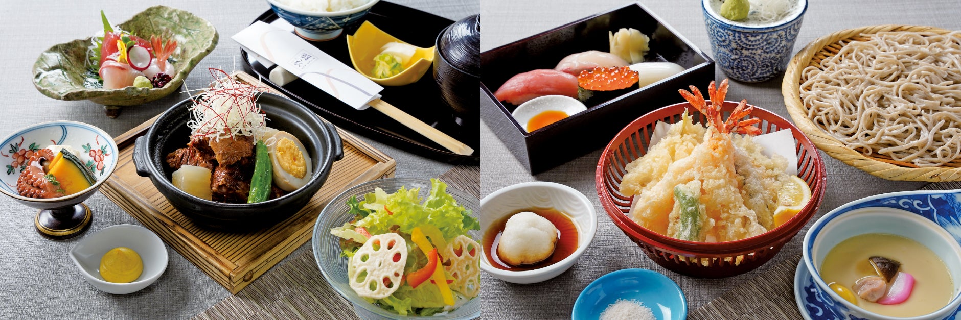 厳選された国産の黒毛和牛を熟練の技でじっくり丁寧に煮込んだ贅沢な「黒毛和牛煮込み御膳」。新鮮な海の幸と揚げたての天麩羅、風味豊かなそばを愉しめる「にぎり蕎麦御膳」。