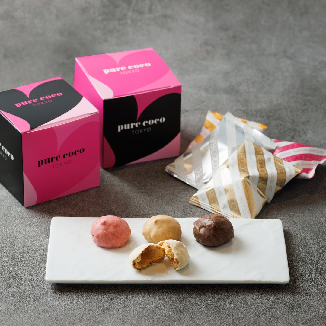 サクサクのシュー生地にホワイトチョコレートとパウダーシュガーをまとわせた“ピュアココ ホワイト”、シュー生地の隠し味に使用しているブラックペッパーがアクセントのカカオの豊かな風味がひろがる “ピュアココ ミルク”、ラズベリーの爽やかな酸味とホワイトチョコレートのミルク感が相性抜群な“ピュアココ ラズベリー”、キャラメルの香ばしさと、濃厚でありながら上品ですっきりとした味わいの“ピュアココ キャラメル”の4種の味わいがお楽しみいただけます。