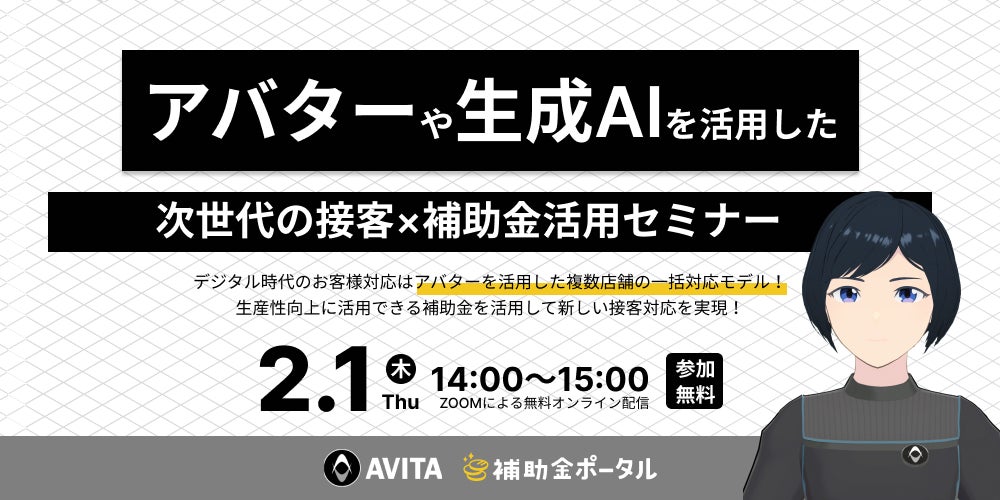 セミナーでは、AVITA株式会社によるアバター接客の実態と、その導入による業務効率・生産性向上に関する事例をご紹介いただきます。また、補助金ポータルより生産性向上に資する投資で活用可能性がある補助事業についてご紹介いたします。